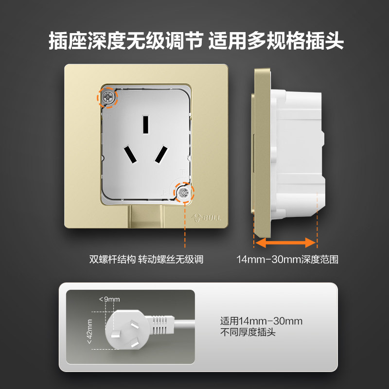 公牛插座嵌入式 插座冰箱一位三极插座香槟金 隐形插座内凹内嵌式
