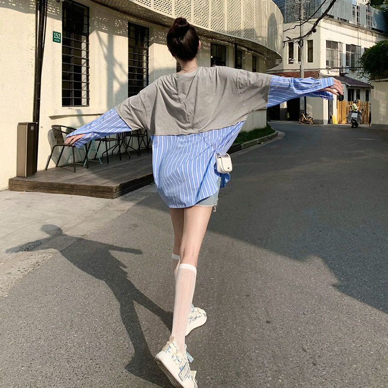 拼接复古印花条纹宽松休闲假两件衬衫 卫衣 MARTIN秋冬新款 ANDREA
