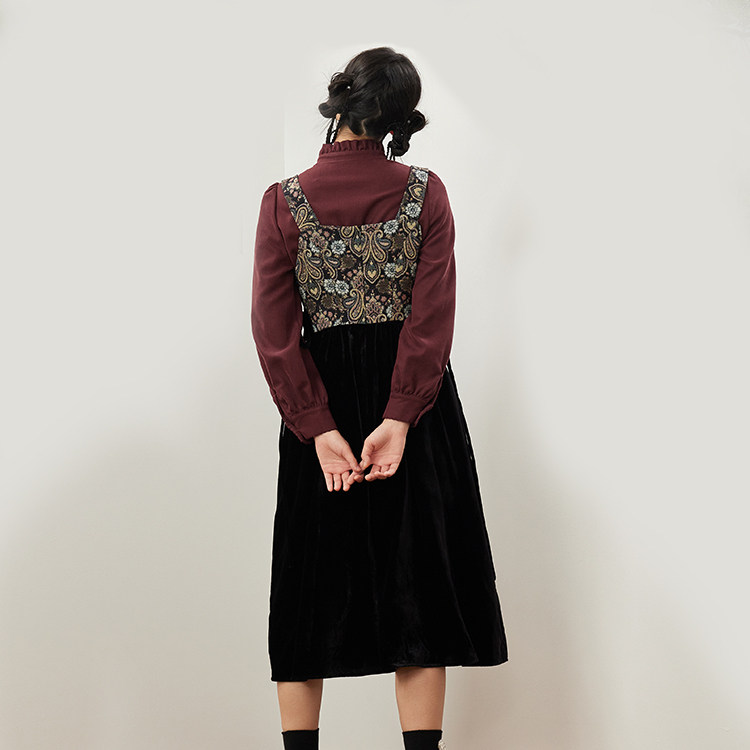 复古时尚 精致壁纸提花丝绒拼接背带连衣裙111E341234 2023冬装 pit