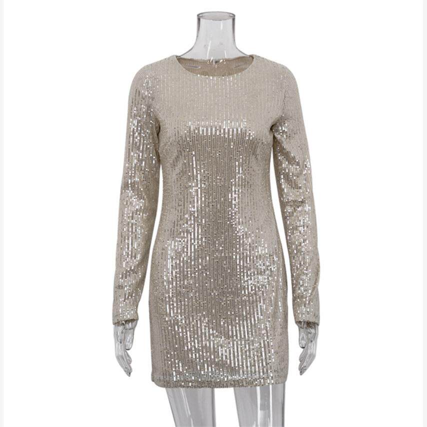 Dress Sequin Long Sleeved 派对短裙连衣裙 欧美圆领亮片包臀长袖
