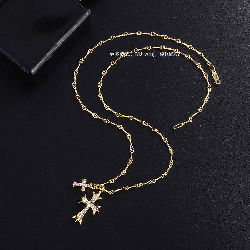 吊坠锁骨链22K黄金竹节链 V金925纯银镶钻大小双十字架金色项链女由