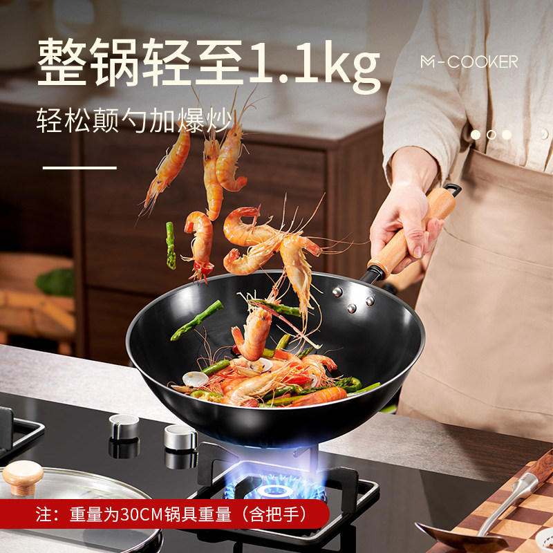 超轻铁锅炒锅家用炒菜锅无涂层平底燃气电磁炉通用32cm不粘爆炒锅
