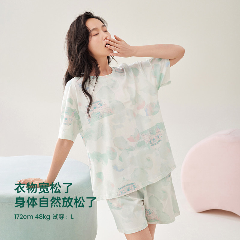 短裤 安之伴纯棉睡衣女士新款 夏季 短袖 休闲卡通可外穿家居服套装由