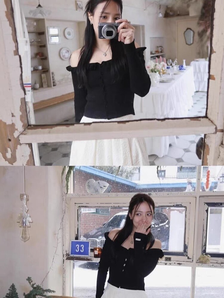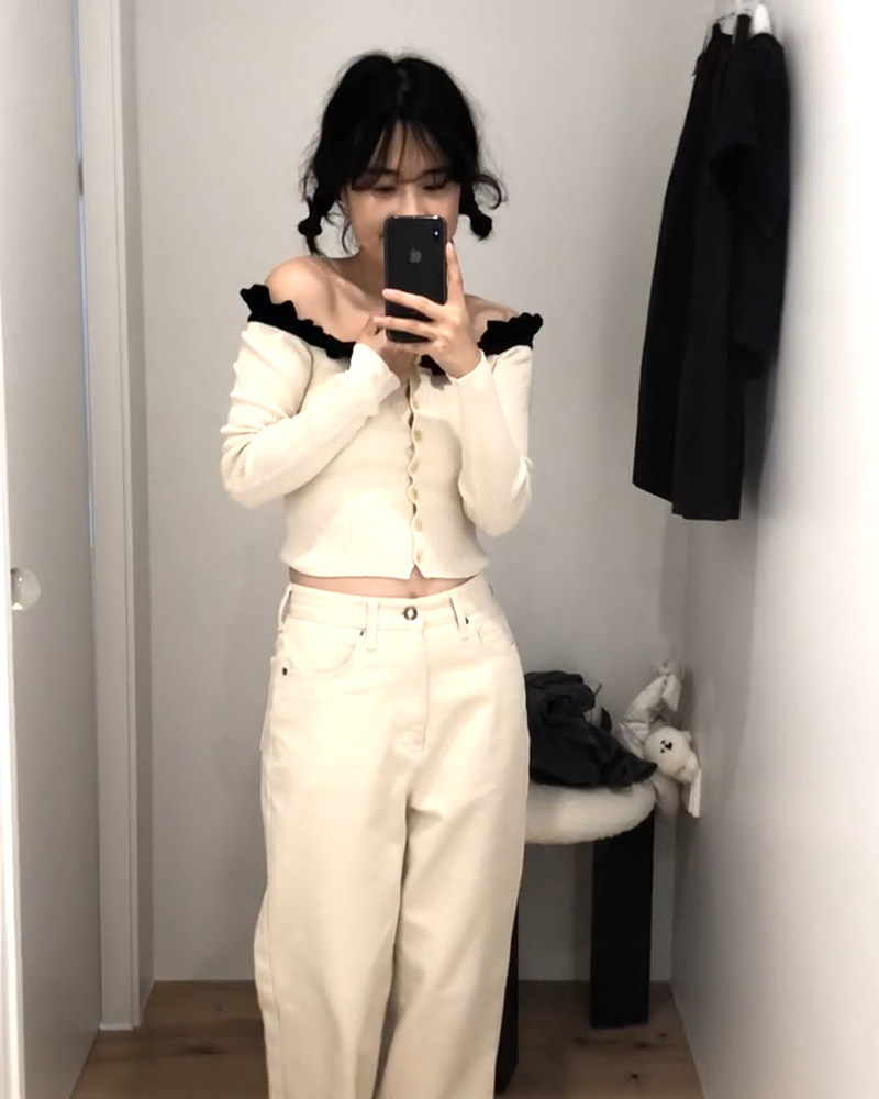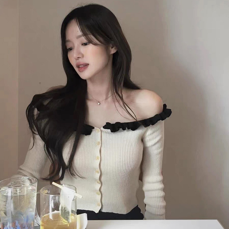 新款 韩国东大门overdueflair气质荷叶边一字肩针织上衣女 现货由