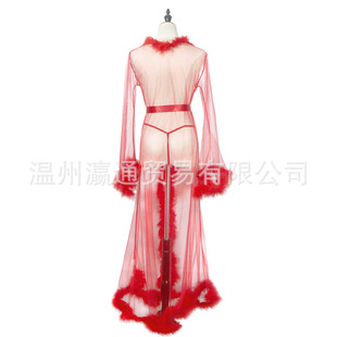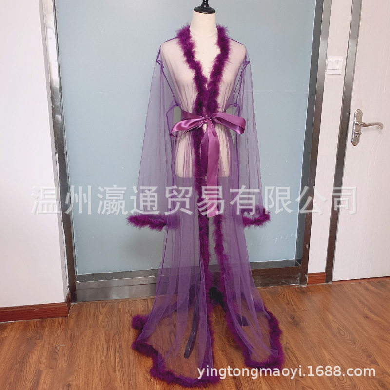 透明睡袍毛边网纱长袍 lingerie fur robes 确定内衣 女士性感爆款