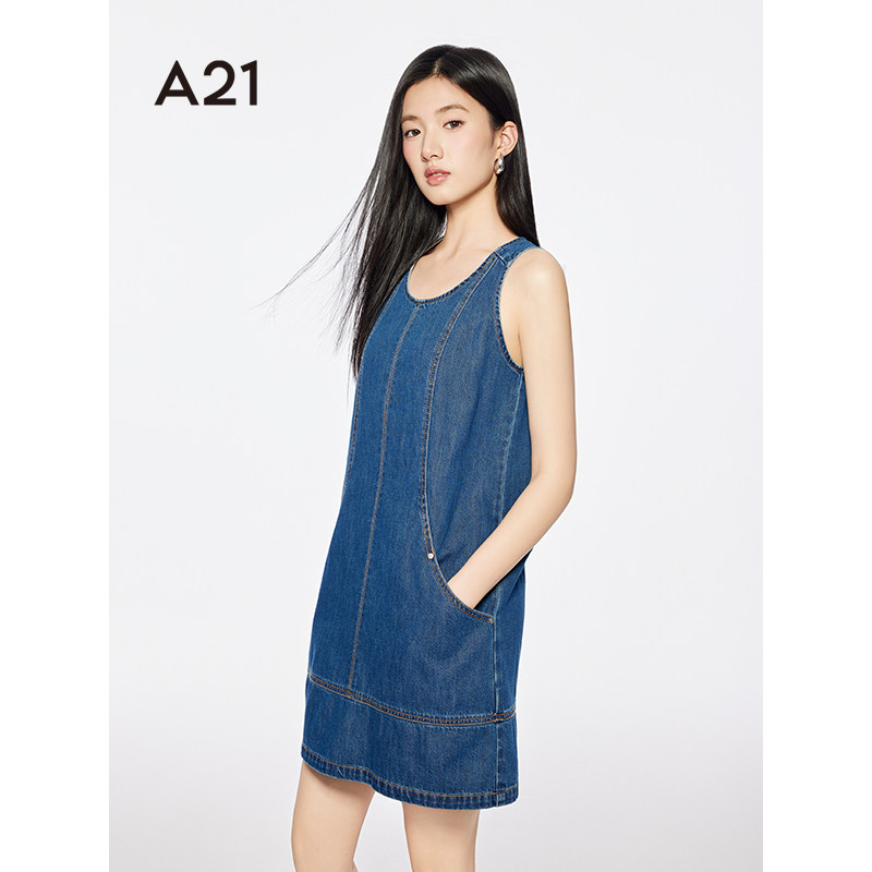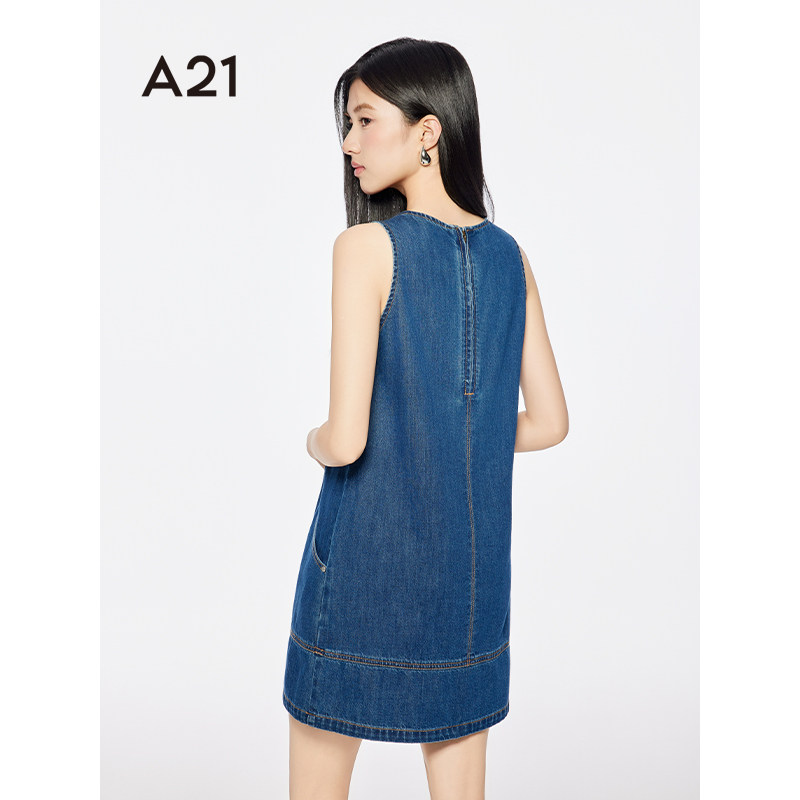 A21女装 宽松牛仔裙2025夏季 新款 简约圆领套头A字连衣裙 浅中蓝无袖