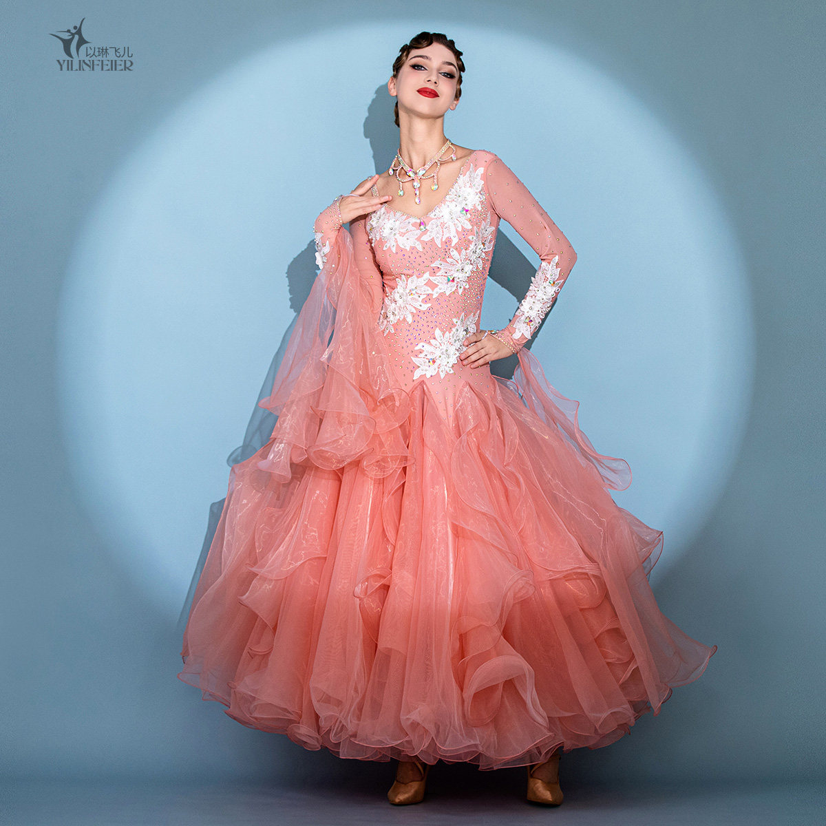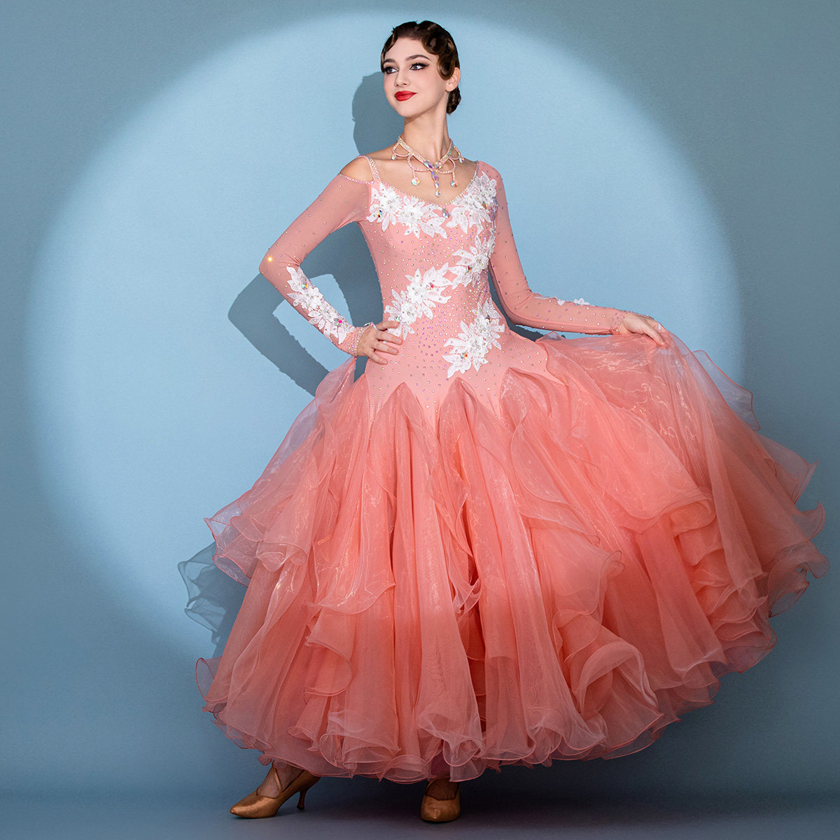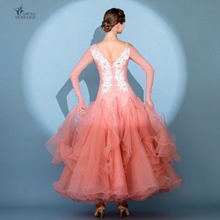 色料 摩登舞裙S7107国标舞连衣裙华尔兹镶钻舞服 英式 皮粉白茉莉由