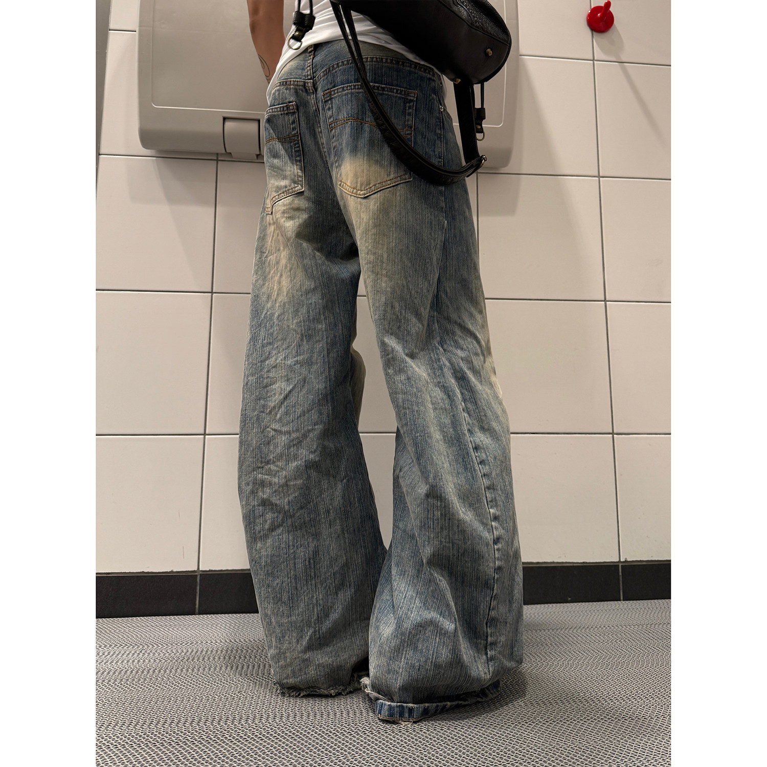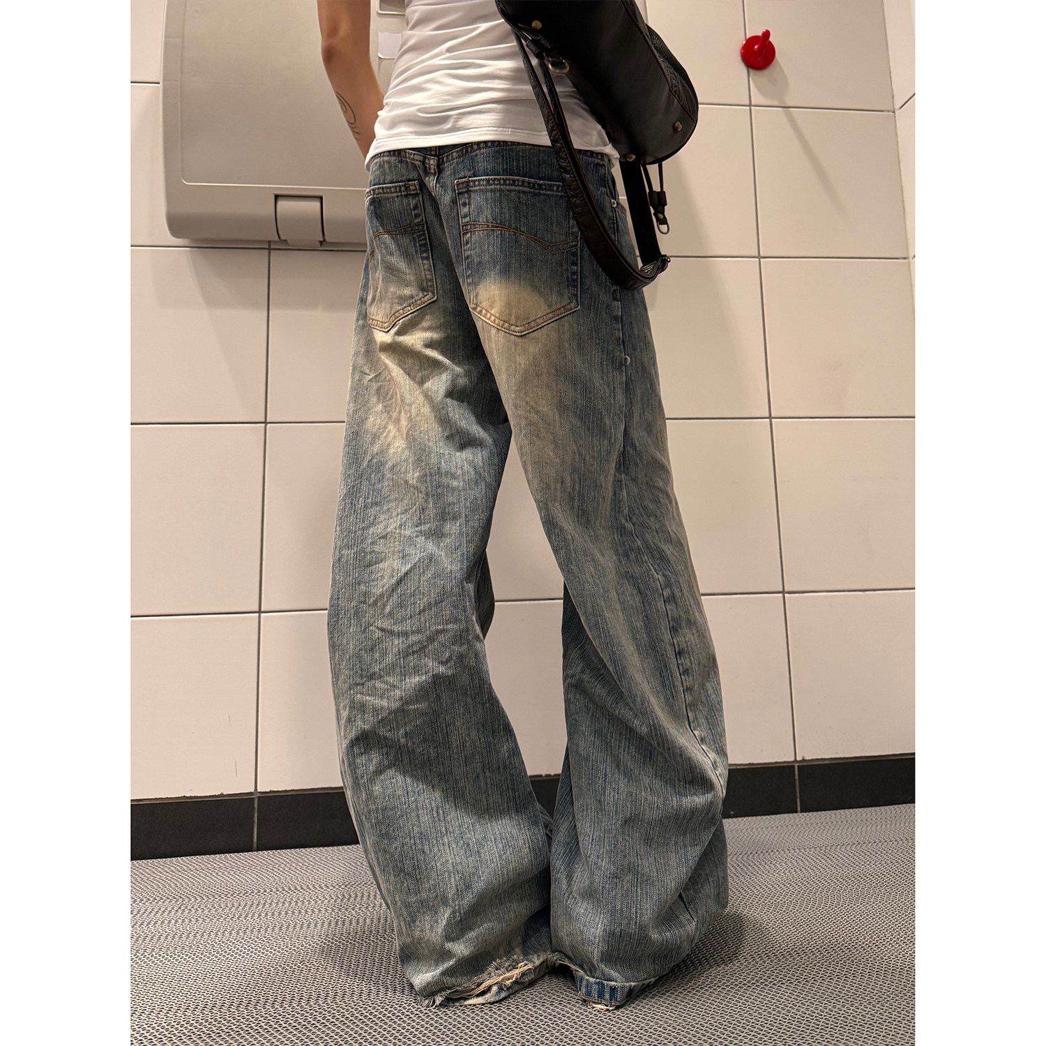 F383 复古水洗蓝竹节纹阔腿牛仔长裤 慵懒宽松直筒弯刀裤 男女 美式由