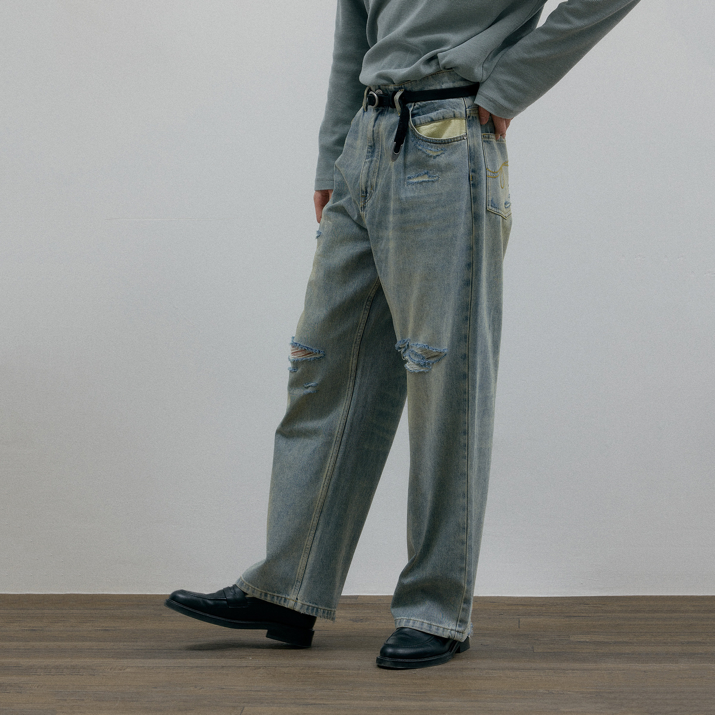 高街休闲牛仔裤 街头复古口袋刺绣辣妹百搭宽松长裤 eihey诶嘿美式