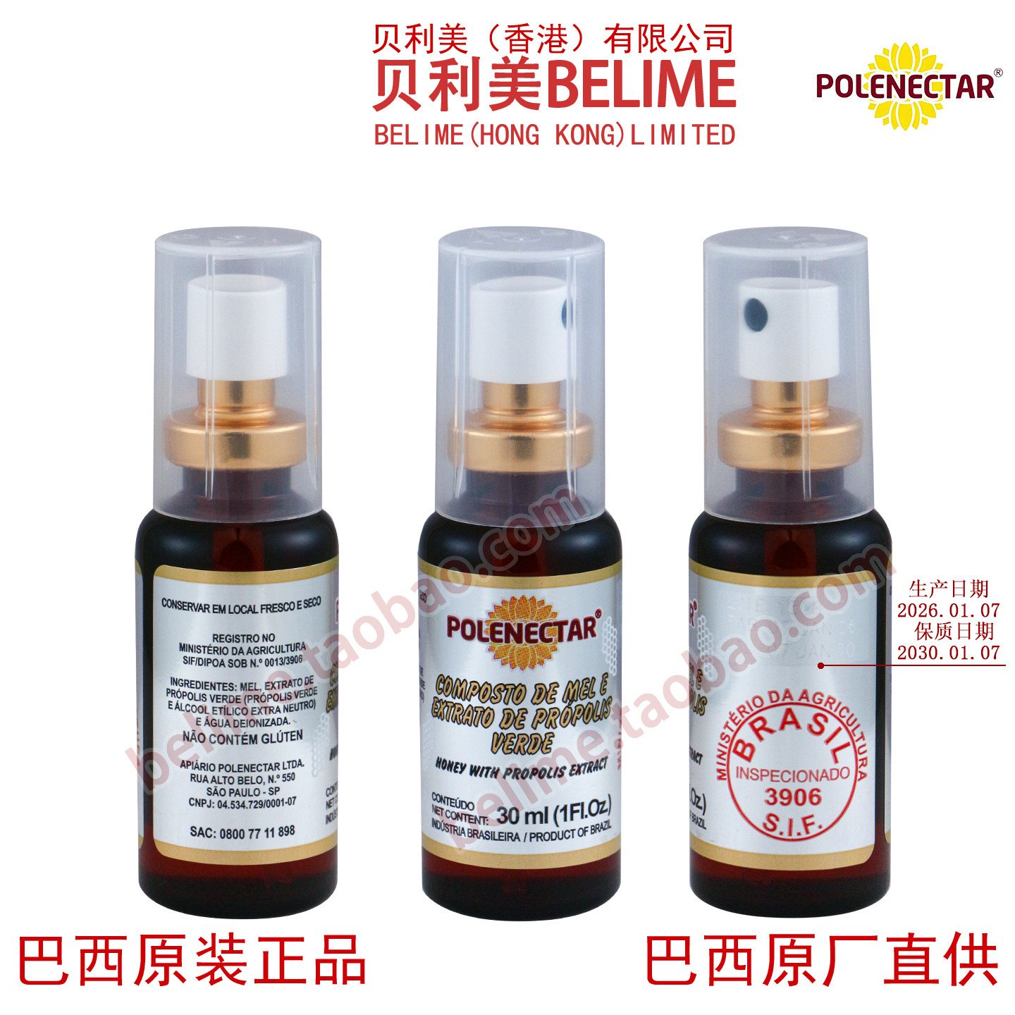 巴西原装 进口 口腔咽喉30ml 贝利美蜂胶巴西POLENECTAR绿蜂胶喷剂由