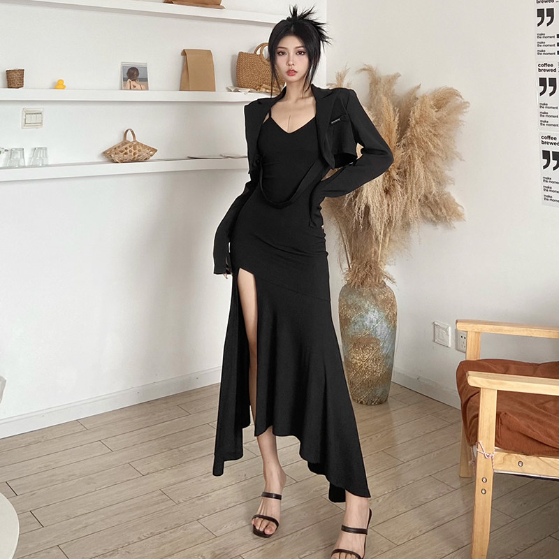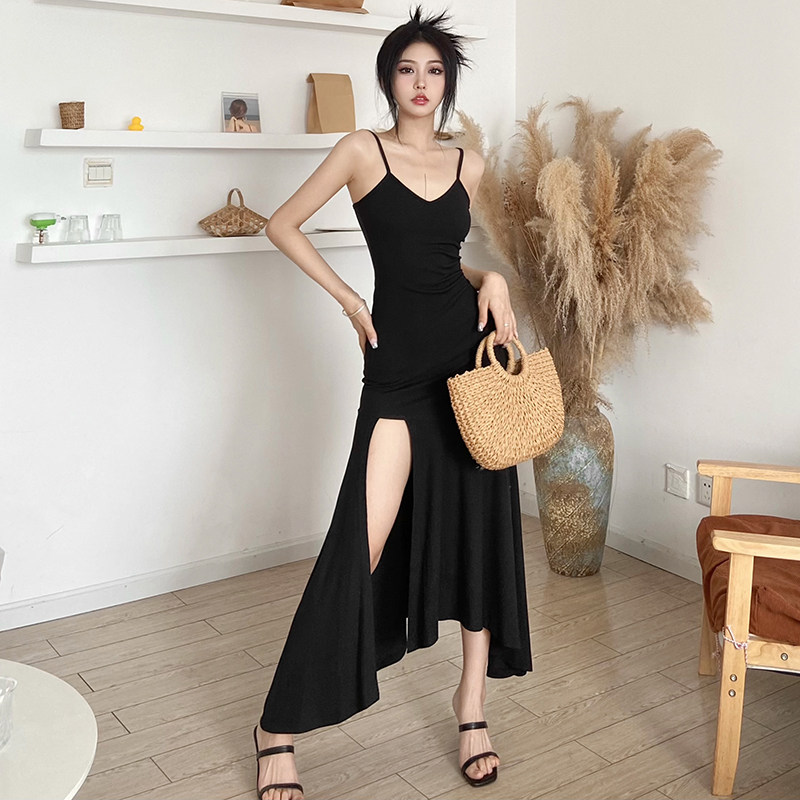 WEIRD 辣妹黑色吊带连衣裙设计感不规则开叉显瘦鱼尾长裙 PUSS法式