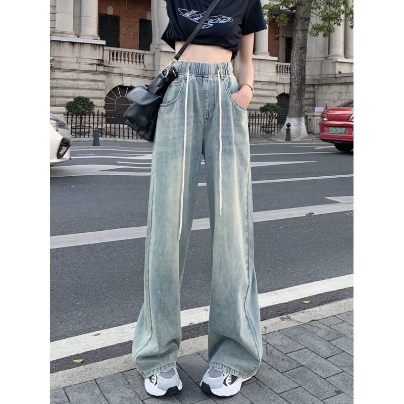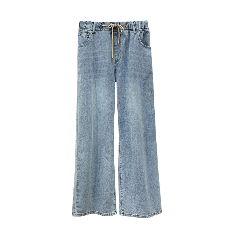 300斤胖mm大码 复古松紧腰抽绳牛仔裤 女高腰显瘦直筒阔腿长裤 女装由