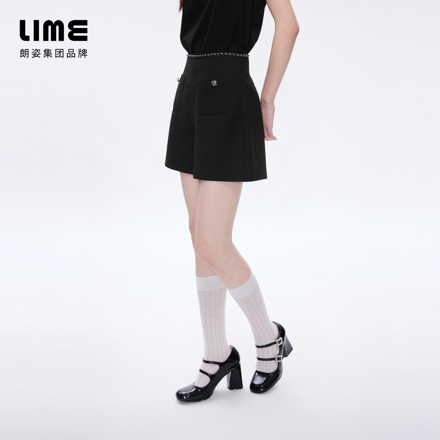 朗姿 饰黑色阔腿短裤 夏小香风显瘦女裤 LIME莱茵高腰金属链条装由