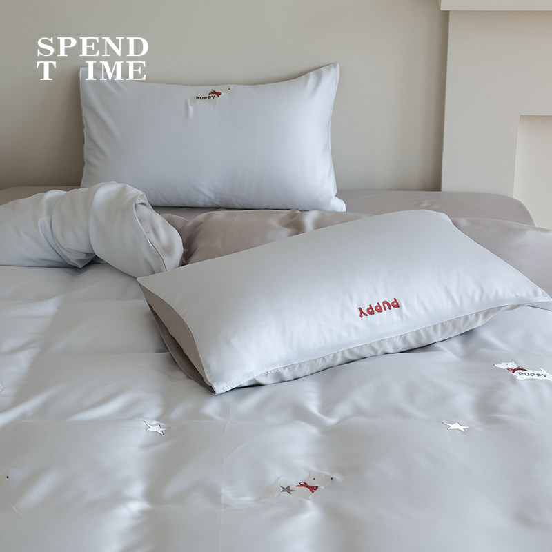 60S兰精天丝床上四件套 花时间生活卡通小狗刺绣床单被套亲肤夏季
