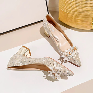女2026新款 水晶婚鞋 新娘鞋 伴娘粗跟高跟鞋 高级感不累脚婚纱秀禾鞋
