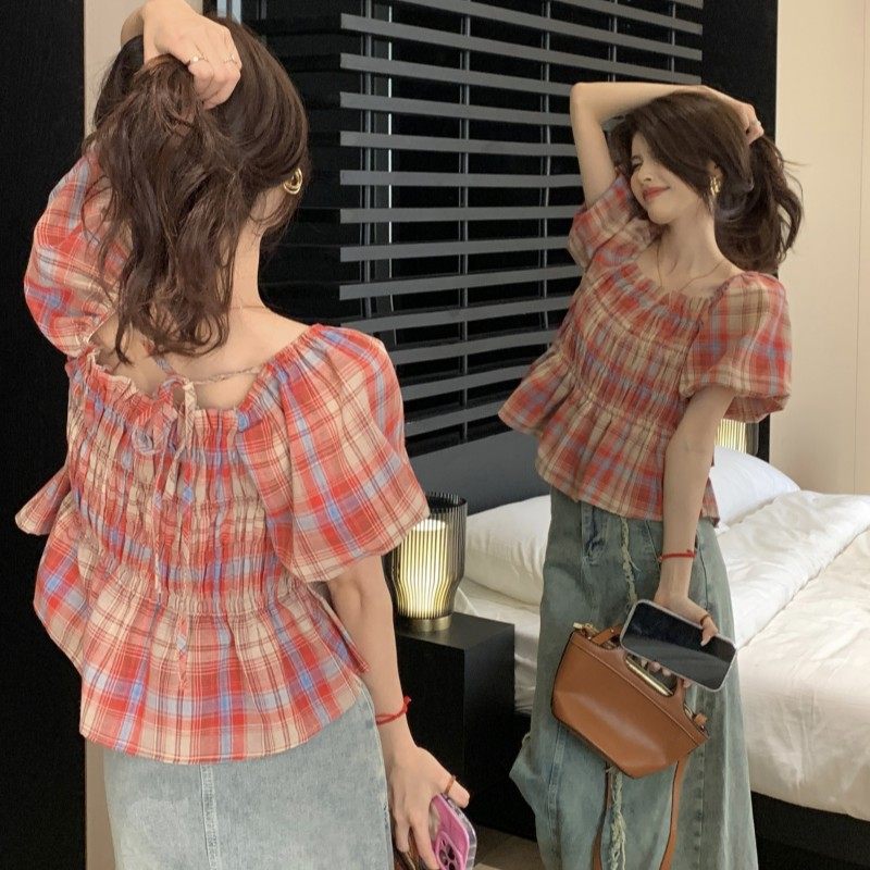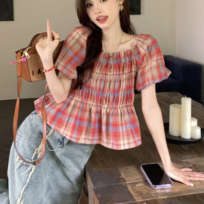 女夏设计感小众宽松短款 法式 方领格子泡泡袖 衬衫 上衣 甜辣收腰小衫