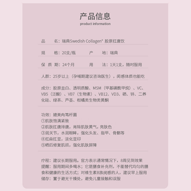 为您提供商品Collagen胶原饮20支紧致扛糖口服液 瑞典小粉瓶胶原蛋白肽Swedish的详细介绍,