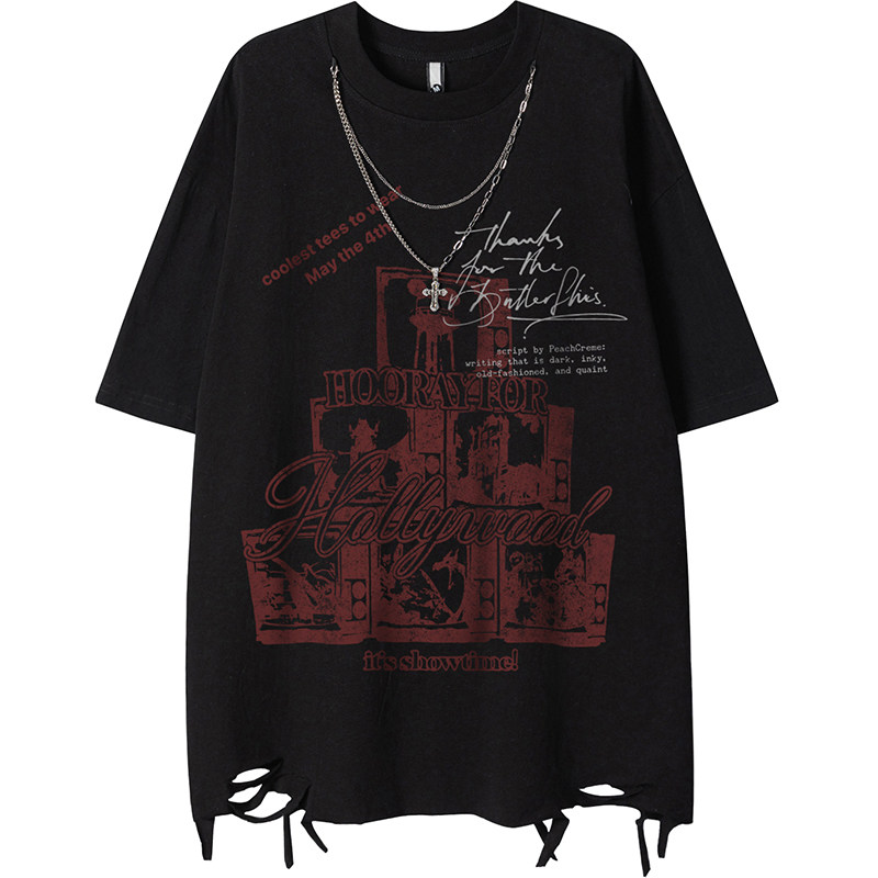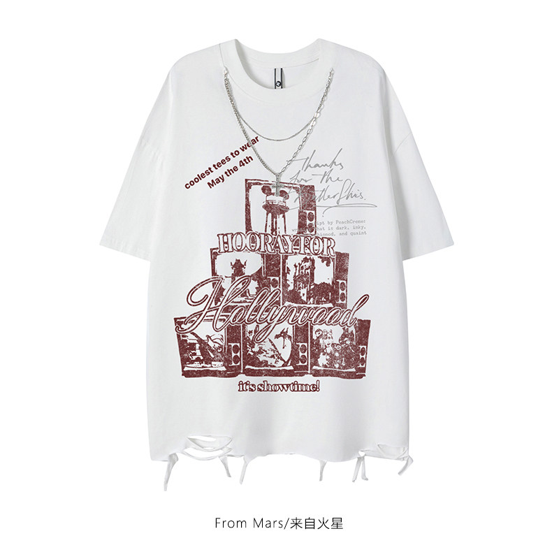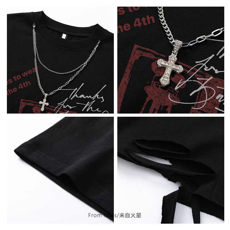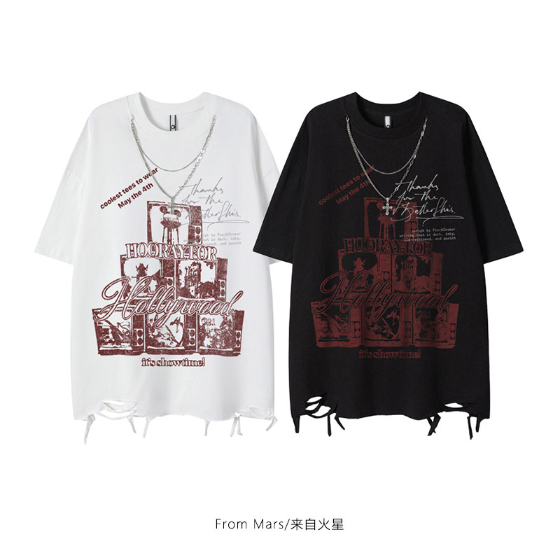 From 不停播放 潮牌街头嘻哈项链吊坠短袖 T恤宽松破洞情侣BF Mars