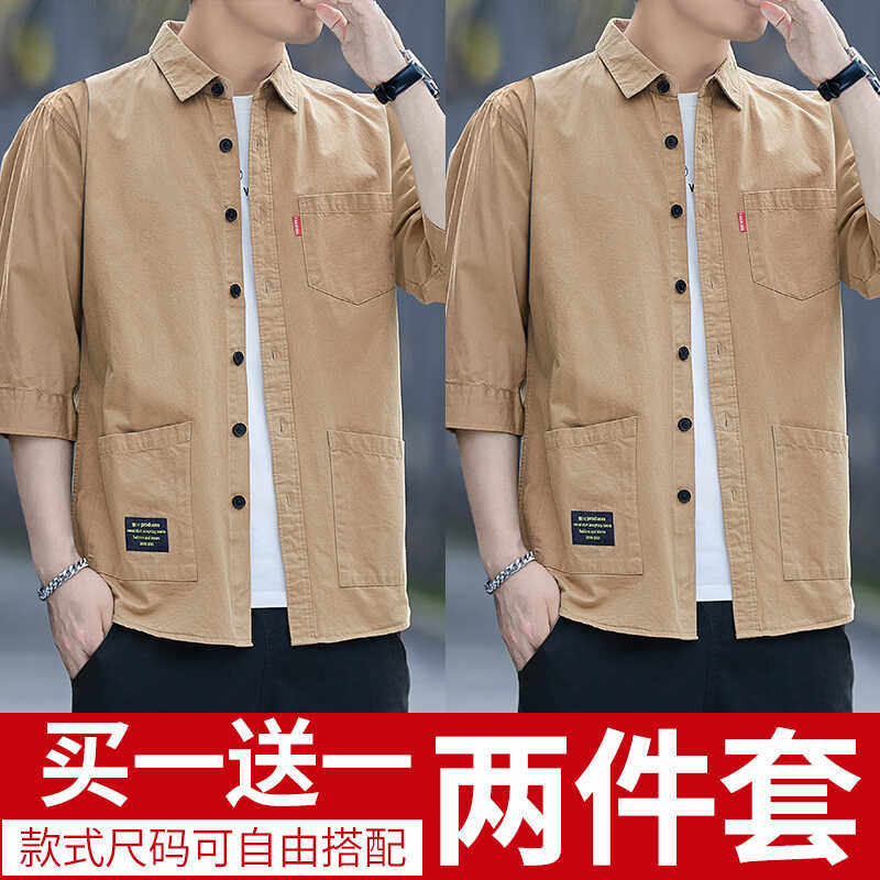 衬衫 外套 高档100%纯棉宽松版 七分袖 短袖 衬衣中袖 港风工装 夏季 男士