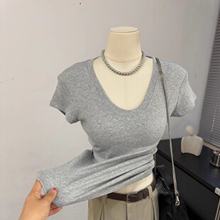 为您提供商品太显瘦了墙推啊 短袖 T恤女绿色显白2025夏新女装 上衣 U领螺纹修身的详细介绍,