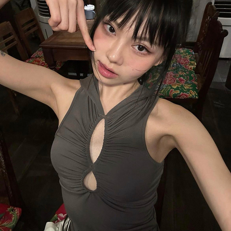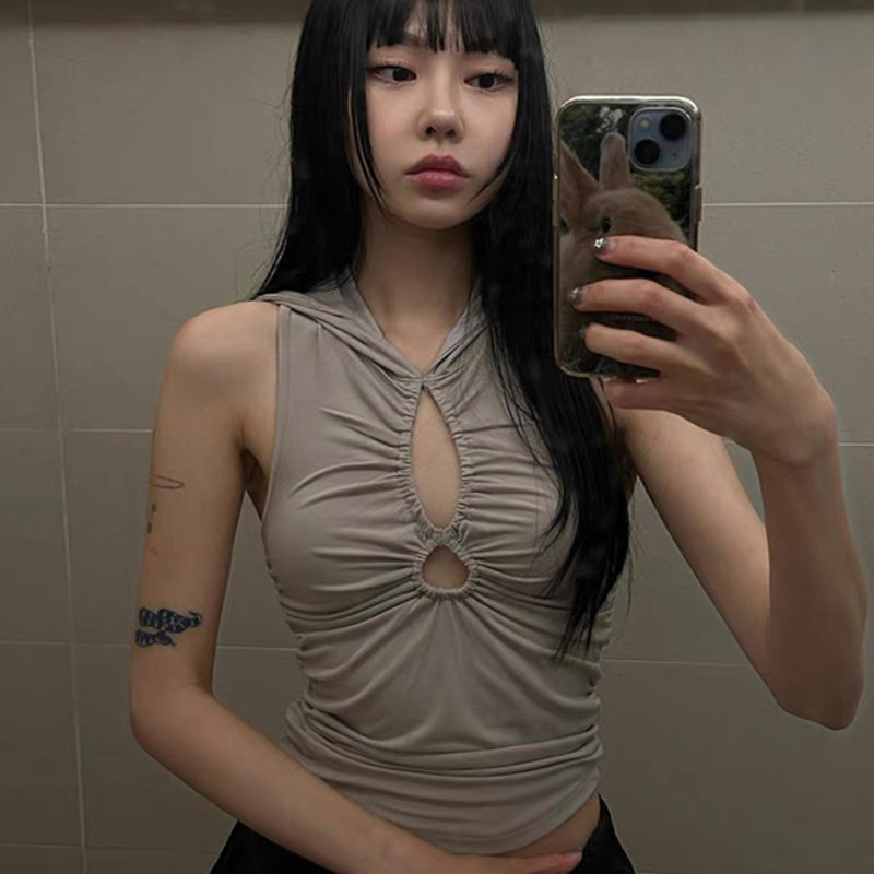 露脐背心夏季 上衣女褶皱收腰显瘦短款 gagaopt纯欲风镂空连帽无袖由