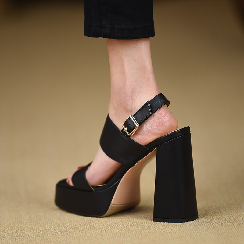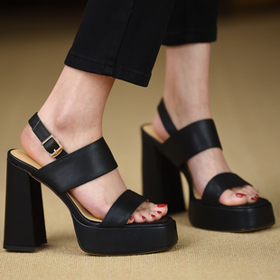 12.2cm方头高跟鞋 misili罗马粗跟凉鞋 夏季 新款 一字带厚底真皮女鞋由