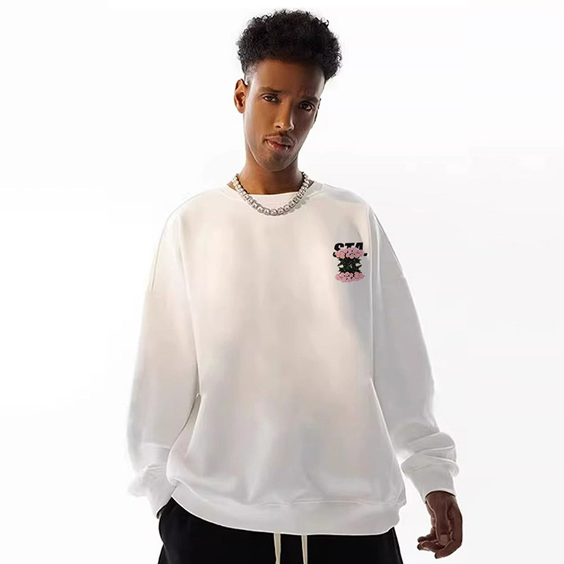 STA24美式 秋冬宽松百搭重磅街头情侣圆领上衣 白玫瑰颠倒卫衣男士