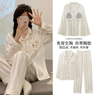 仿真丝绸春夏外穿家居服两件套装 带胸垫一体式 睡衣女春秋冰丝长袖