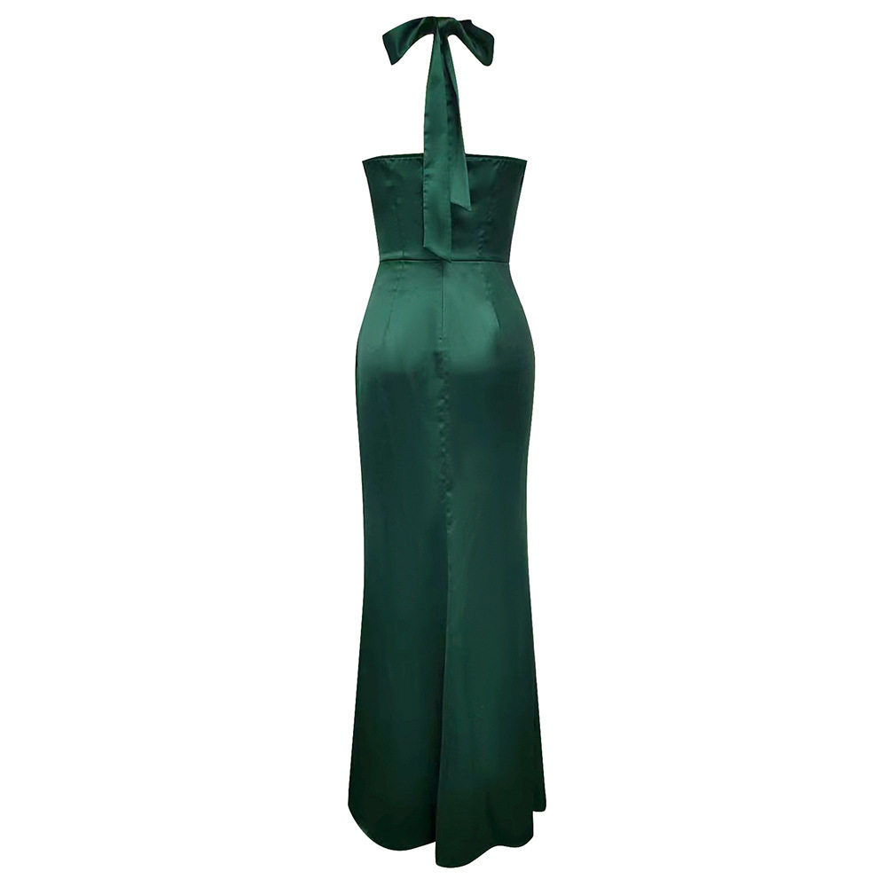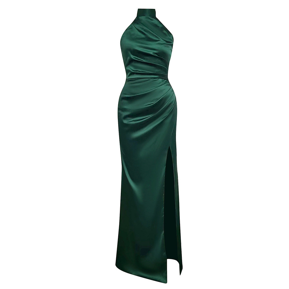 锻面质感连衣裙礼服 欧美女主缎面开衩绿色长裙欧美名媛斜肩无袖