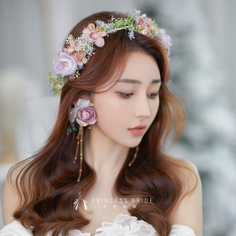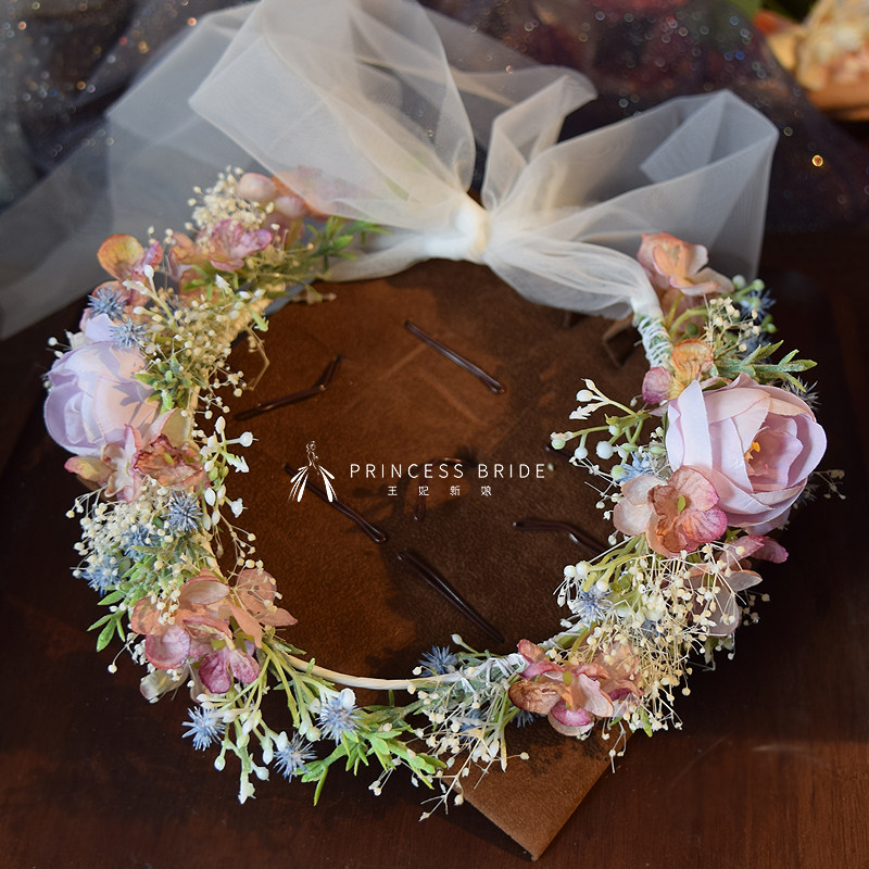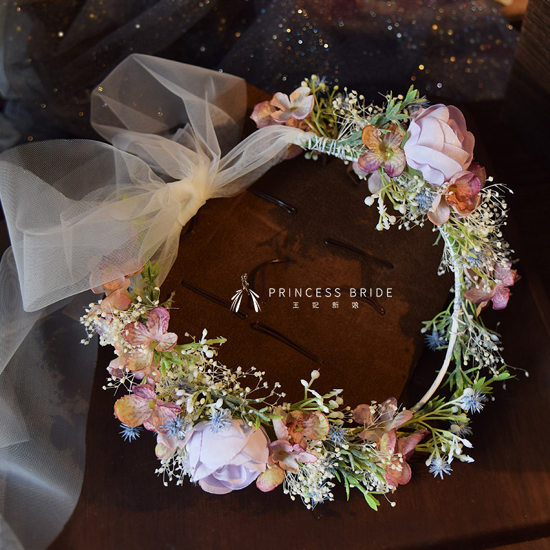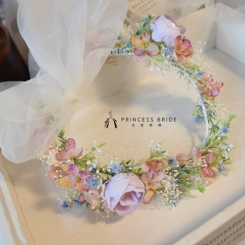 王妃新娘仙美森系花环连纱花朵淡紫浪漫仙美头花旅拍度假影楼头饰
