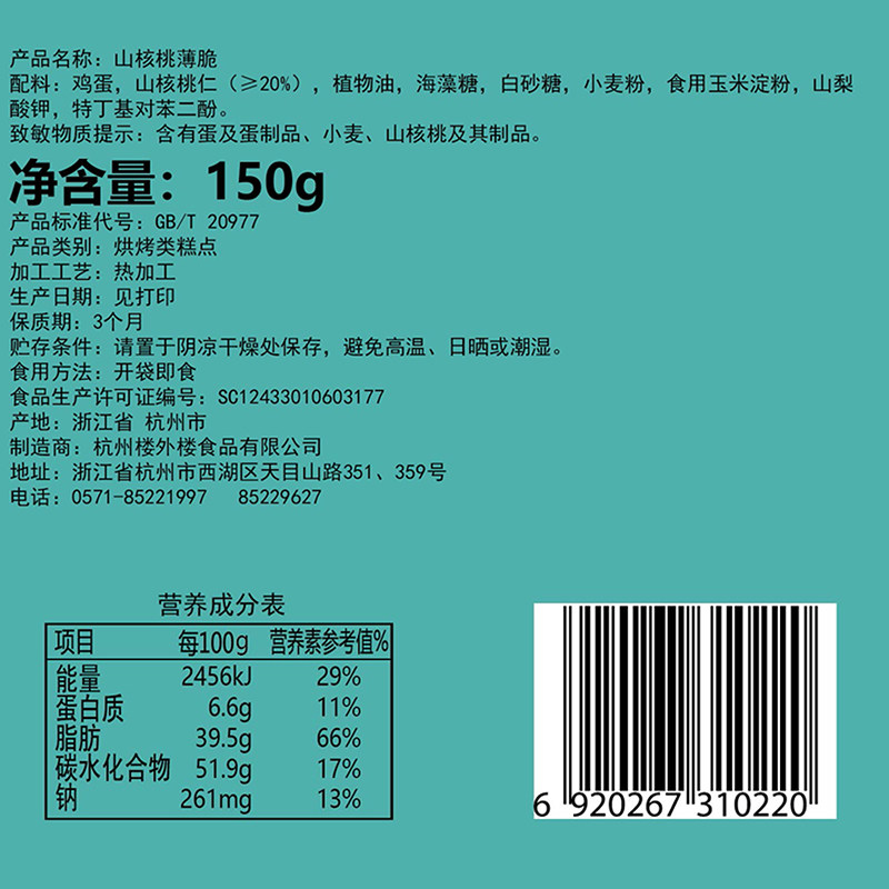 为您提供商品楼外楼山核桃薄脆饼干核桃仁糕点心休闲零食杭州特产老字号150g的详细介绍,