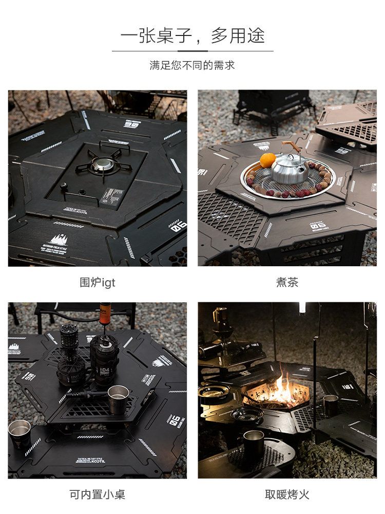 户外igt围炉战术桌露营折叠桌多功能组合桌子烧烤桌野营六角圆桌
