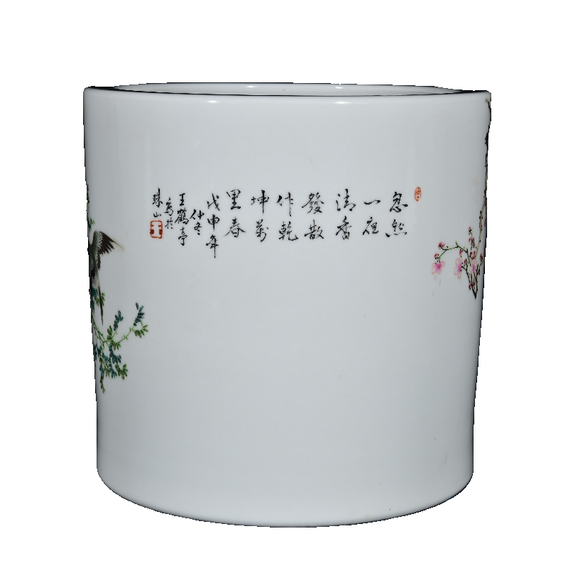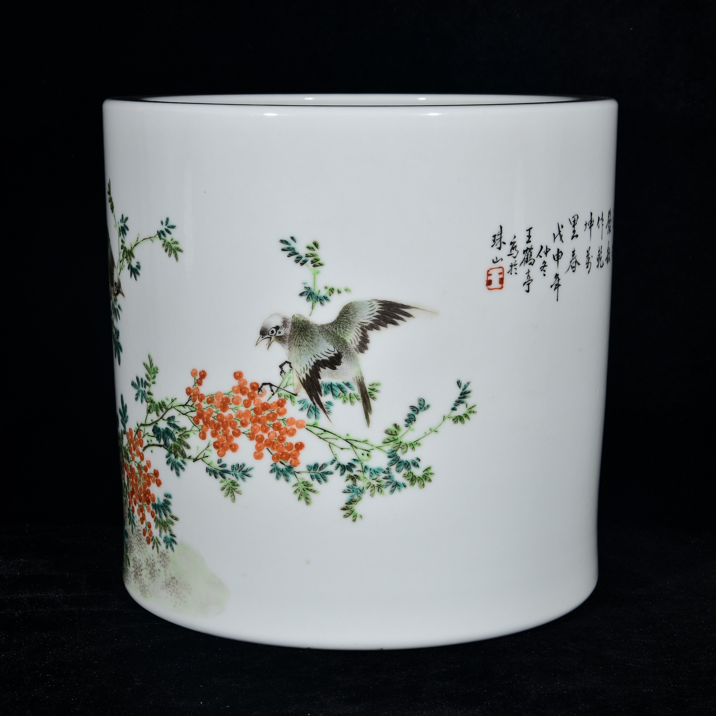 为您提供商品一九六八年景德镇艺术瓷厂美研所王鹤亭绘粉彩花鸟纹香炉笔筒的详细介绍,