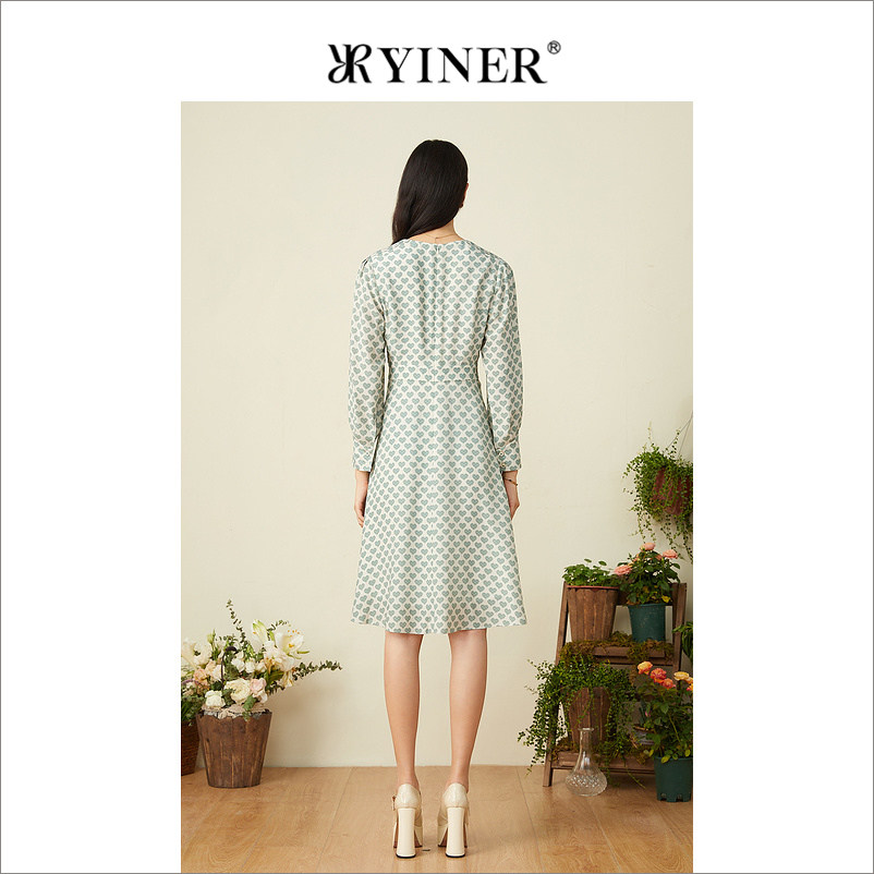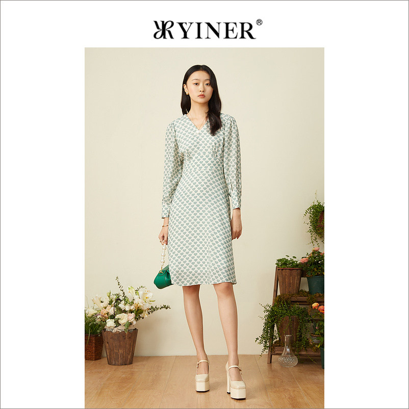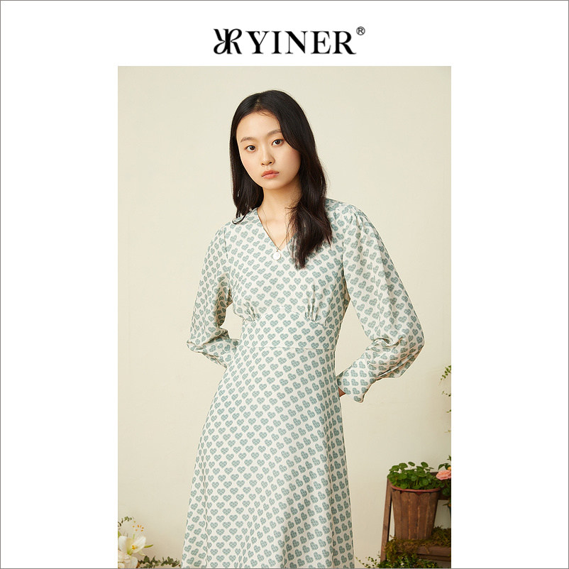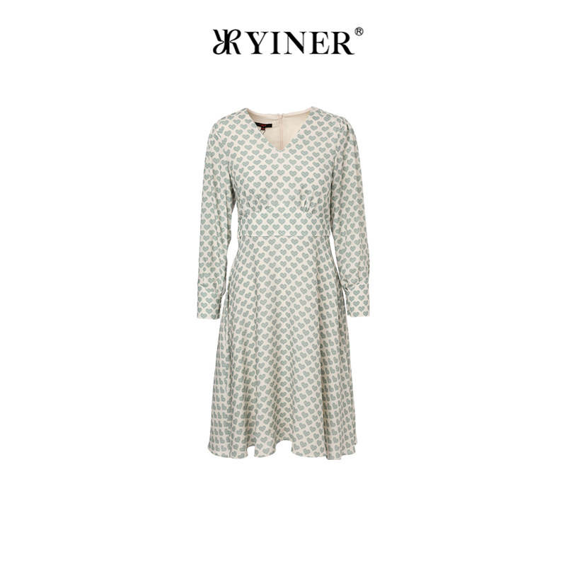 YINER音儿女装 时尚 高腰爱心印花V领长袖 连衣裙 春季