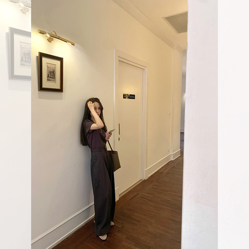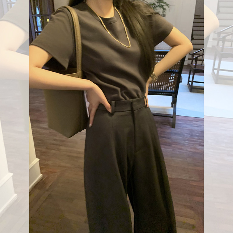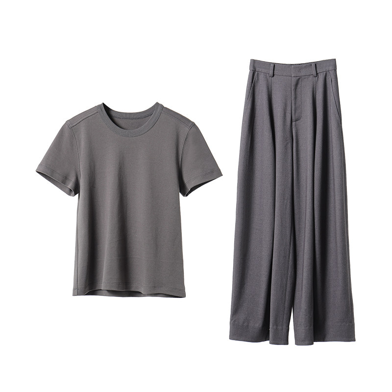 短袖 一套瘦住 日系慵懒味儿 拖地阔腿西装 裤 滑滑T恤 拽酷态度由