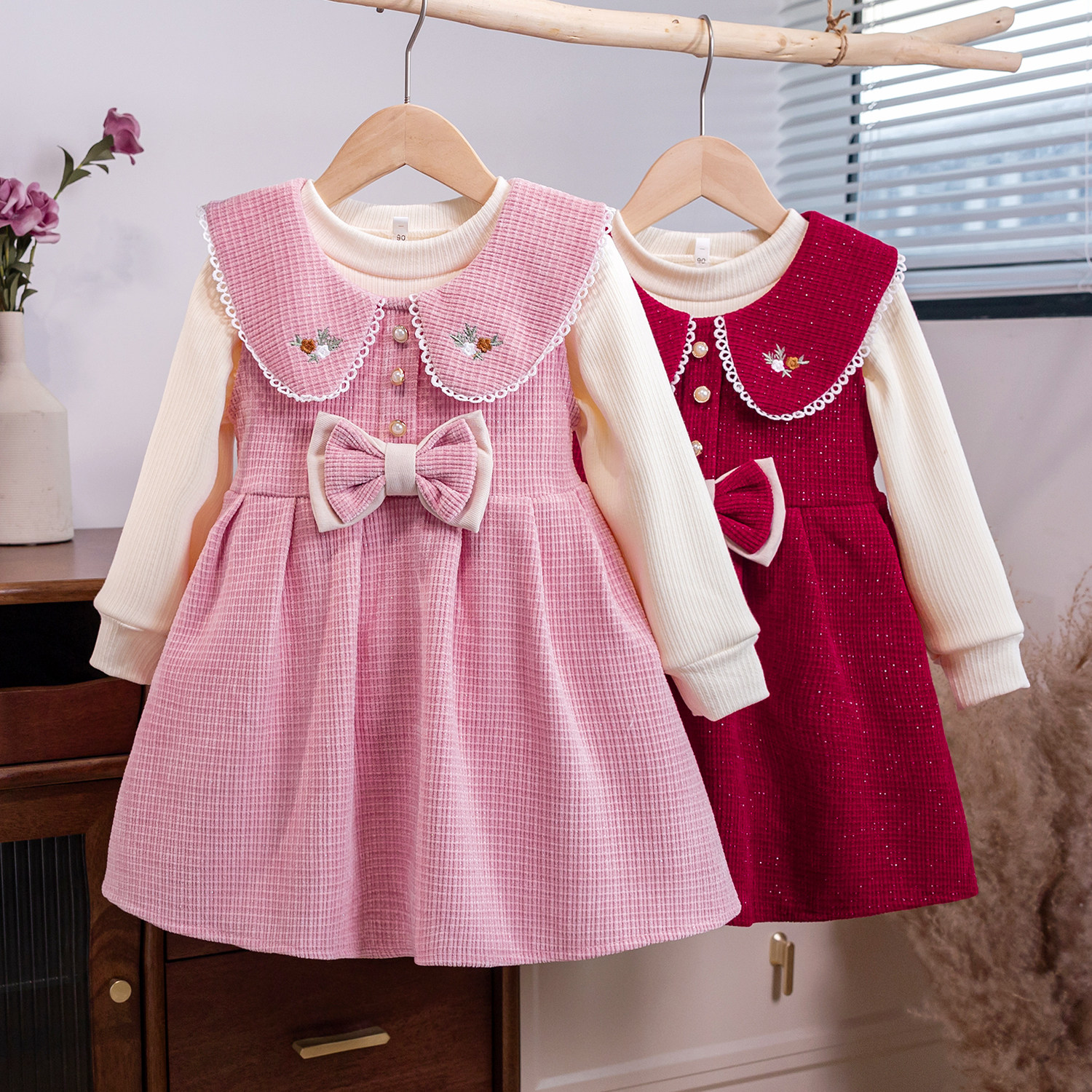 女童蝴蝶结加绒拜年服冬季 女宝宝红色洋气两件套儿童超萌裙子 新款