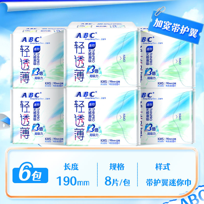 为您提供商品ABC卫生巾姨妈巾护垫迷你巾超薄加长190棉柔护翼48片 正品的详细介绍,