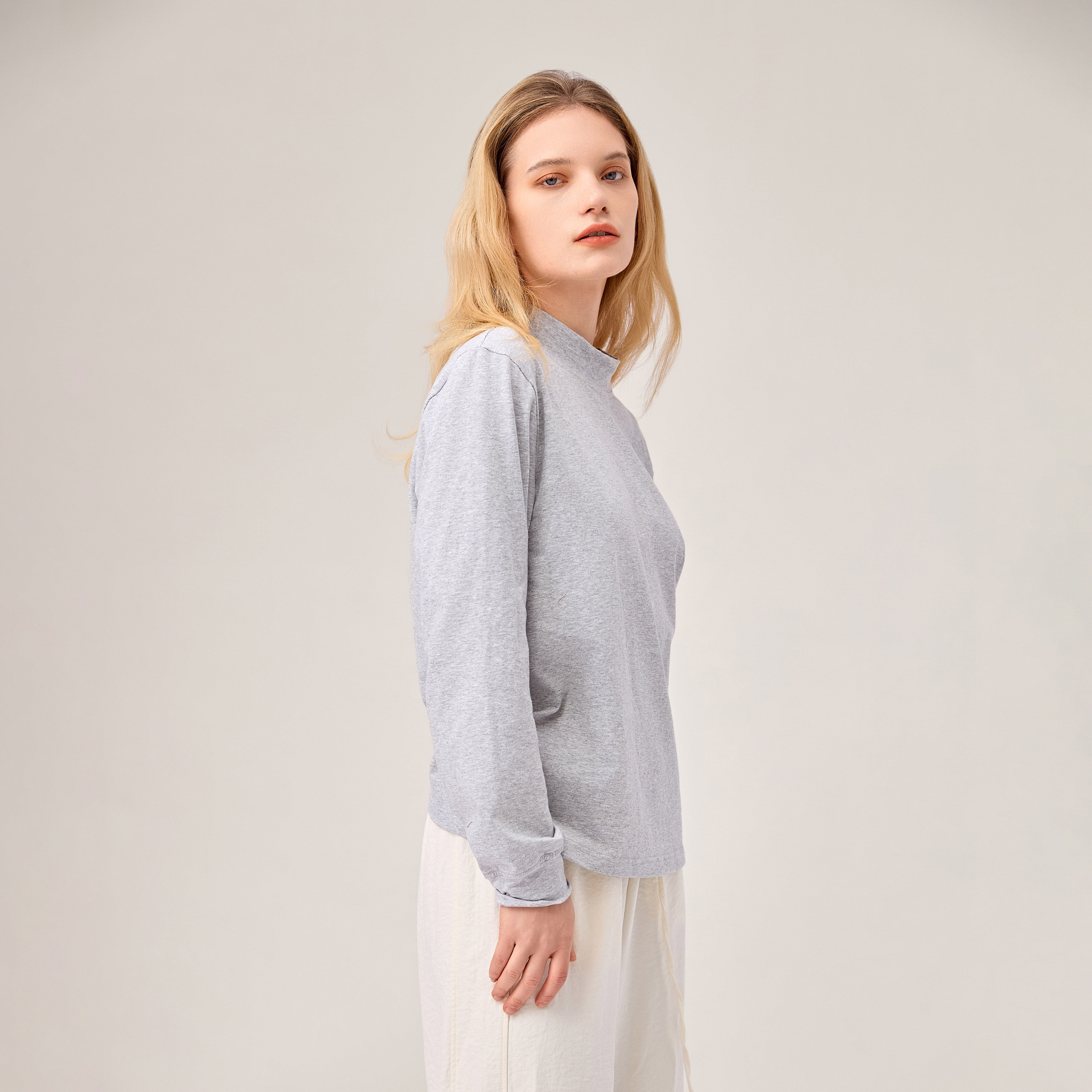 T恤衫 100%有机棉软糯高支高密本白灰色半高领保暖长袖 onrays