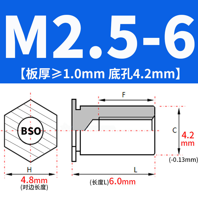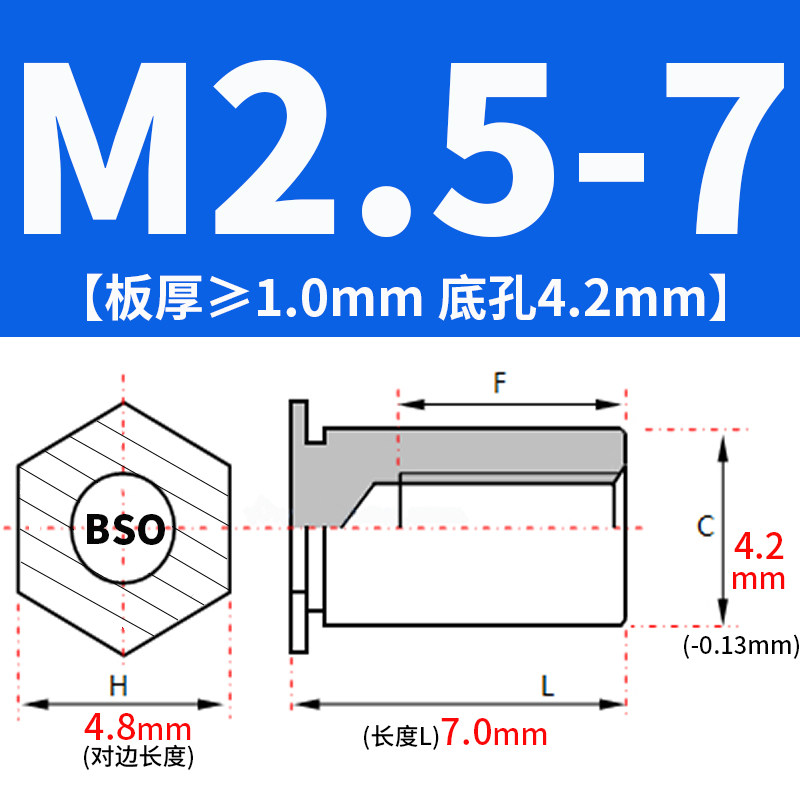 为您提供商品BSO 盲孔压铆螺柱 压板螺母柱 压铆螺柱 L底孔4.2 M2.5的详细介绍,