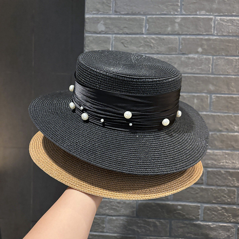 法式 度假遮阳沙滩帽百搭气质珍珠草帽太阳帽子 平顶白色礼帽女夏季