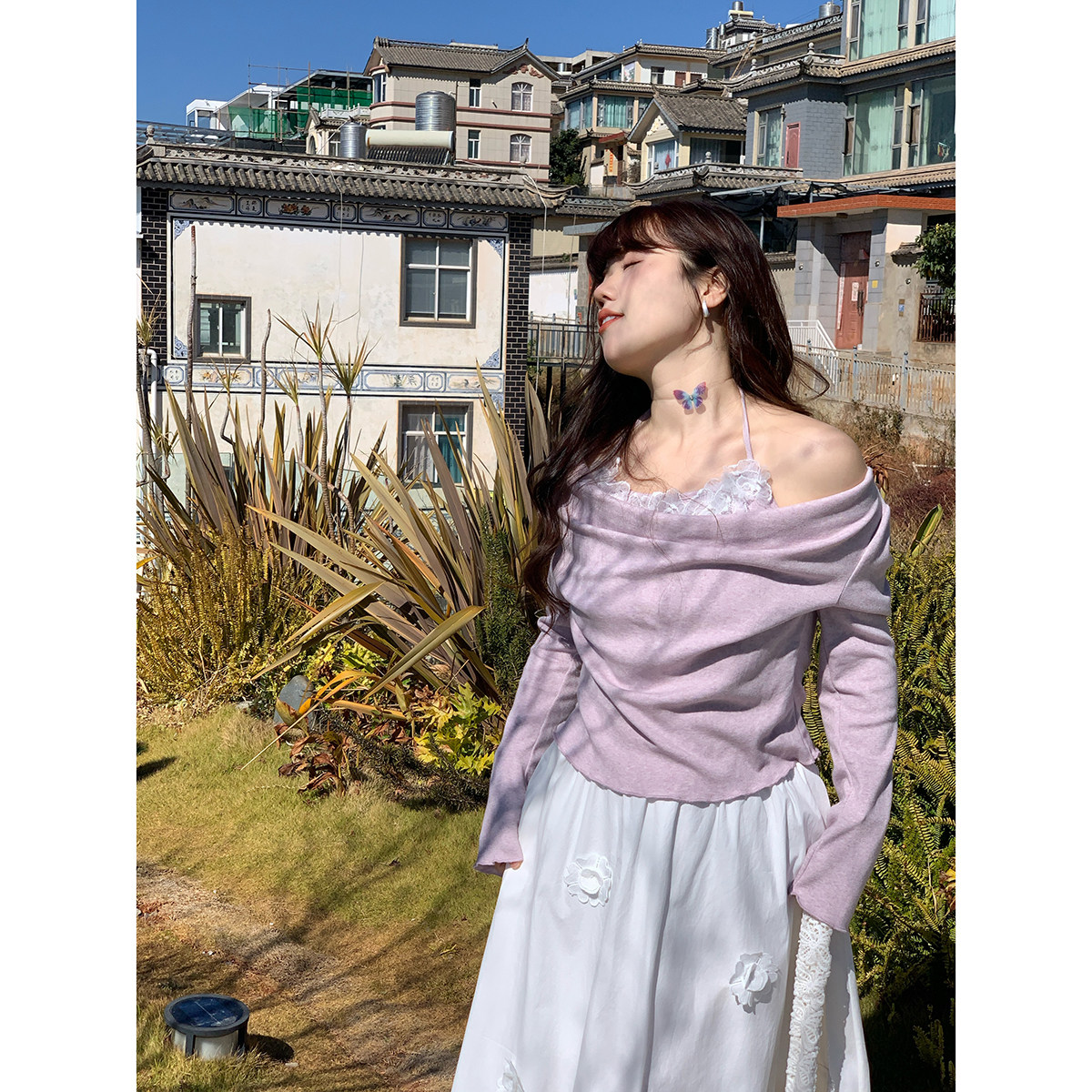 米米子微胖大码 花遇香氛 时尚 气质独特别致挂脖荡领上衣春 胖mm