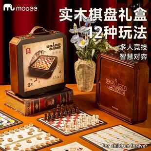 mobee多功能棋盘12合一飞行棋五子军棋象棋实木儿童益智学生玩具