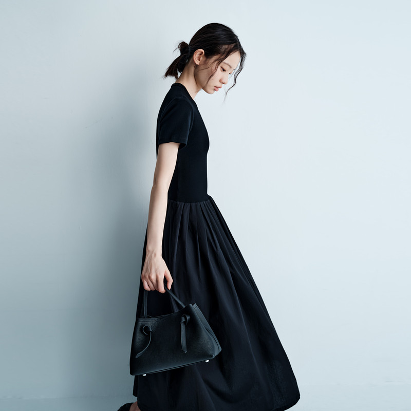 indicia标记25夏新款 L2B5LQ075 黑色简约圆领拼接连衣裙A字长裙由