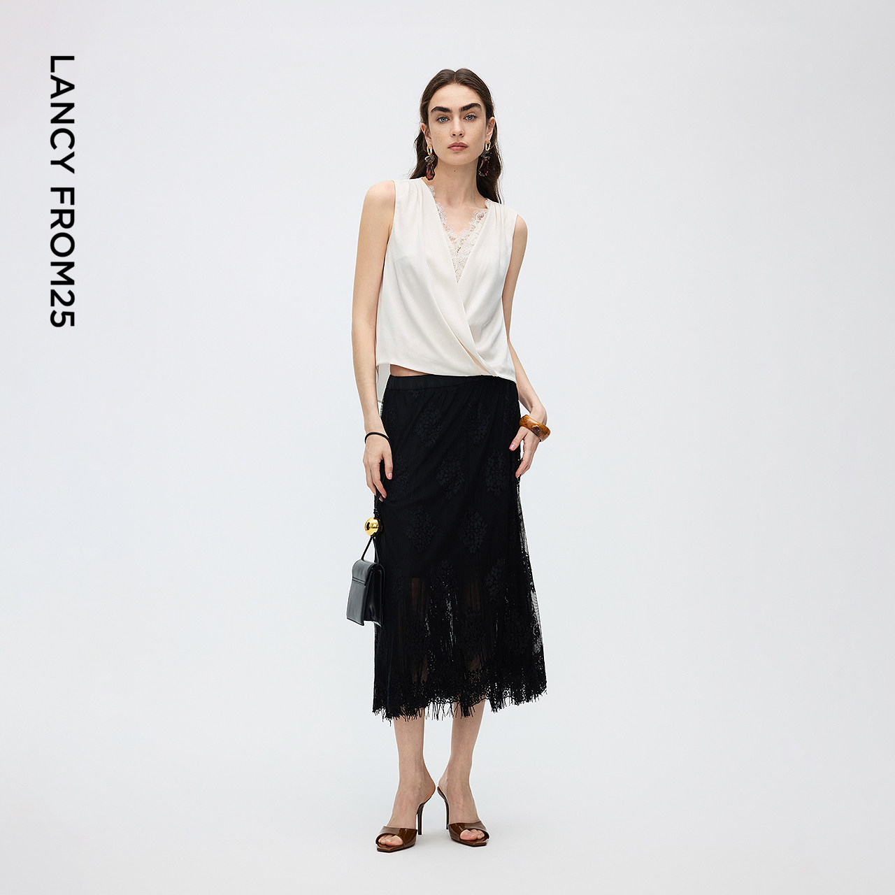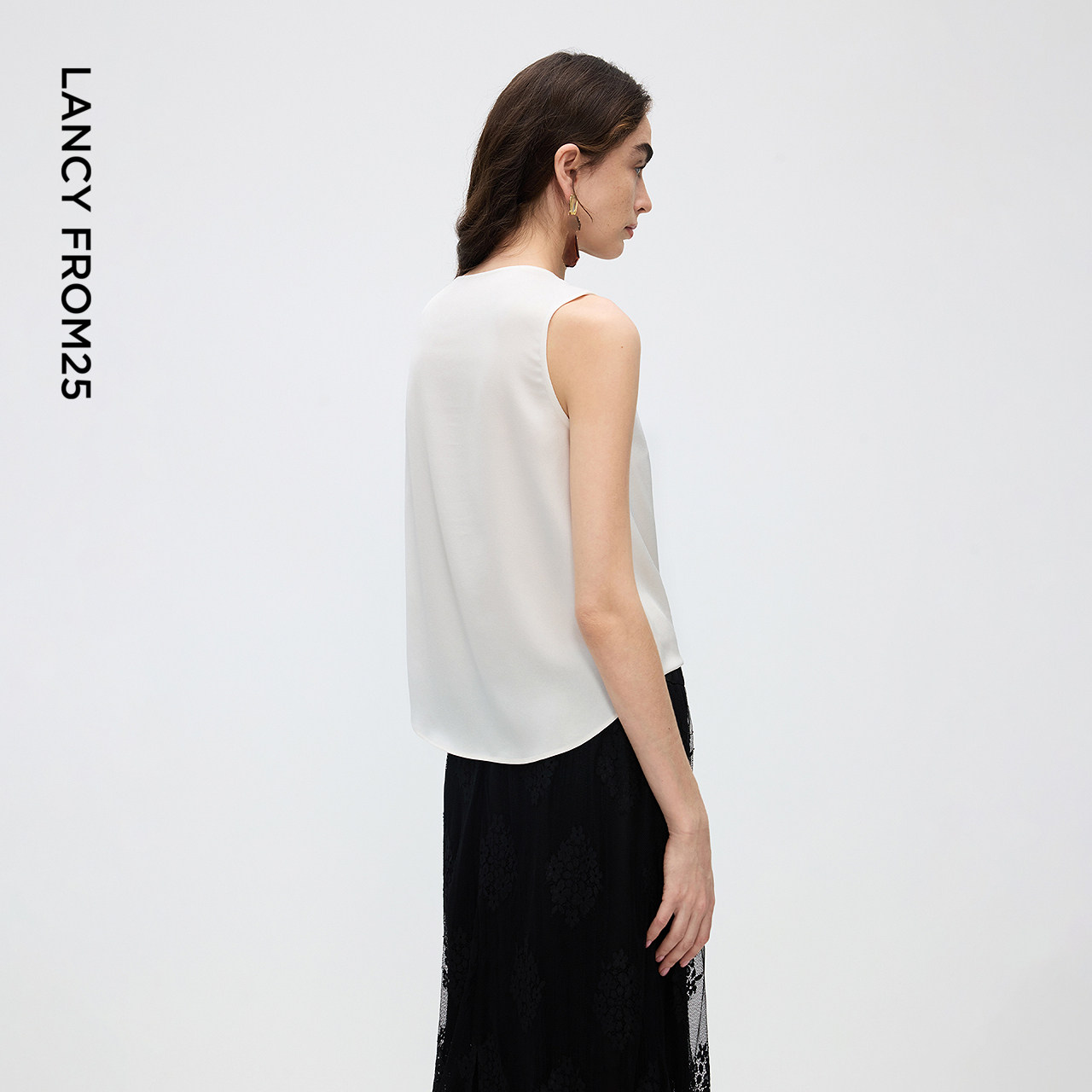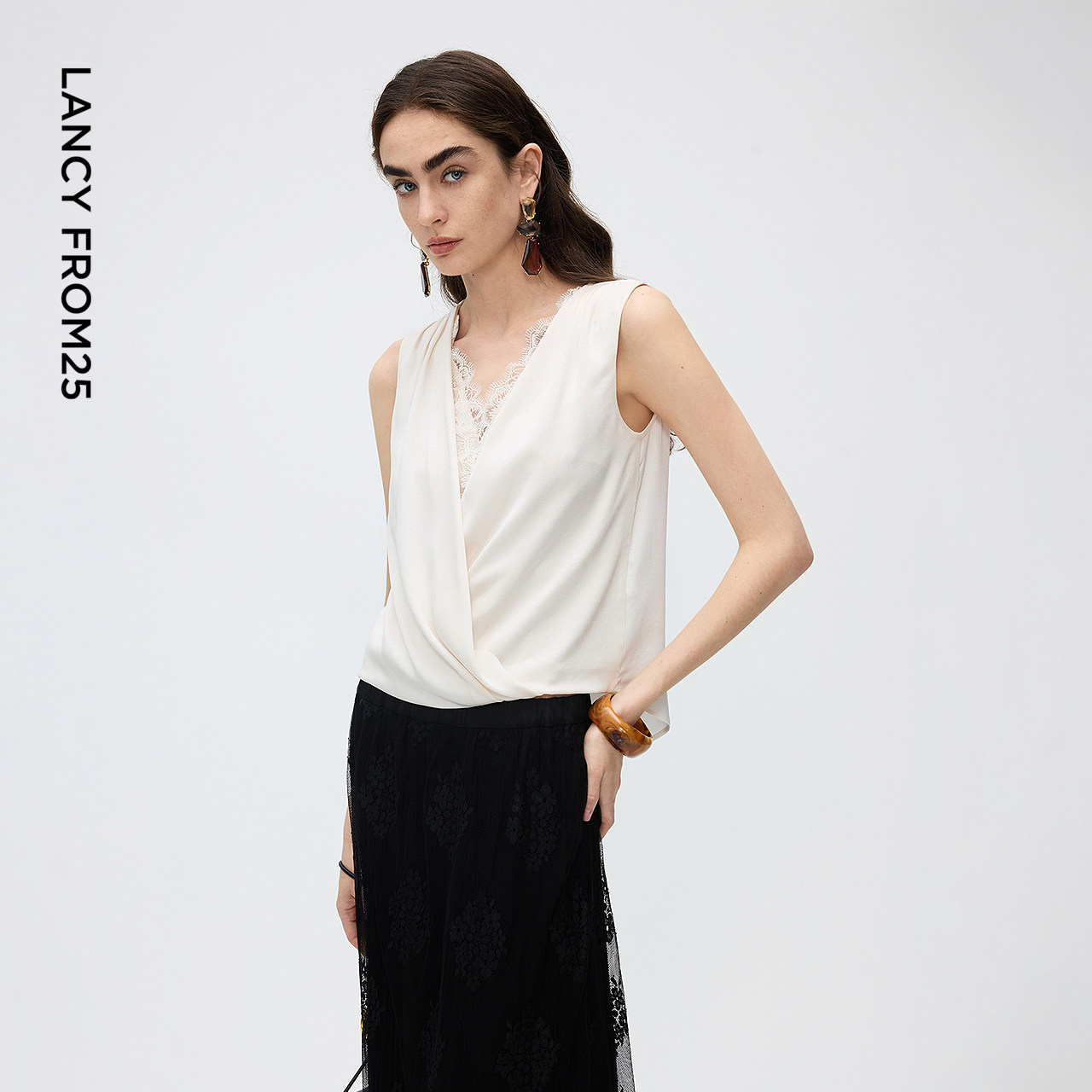 设计感蕾丝拼接背心气质通勤上衣春秋新款 衬衫 朗姿25醋酸v领无袖