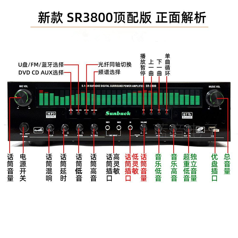 为您提供商品Sunbuck山宇顶配版 5.1声道功放机家用大功率蓝牙卡OK光纤同轴解码的详细介绍,