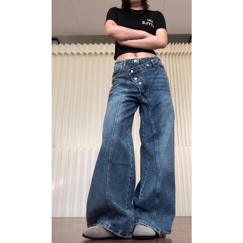 美式 大码 胖mm蓝色不对称解构排扣直筒牛仔裤 女春季 高街宽松阔腿裤
