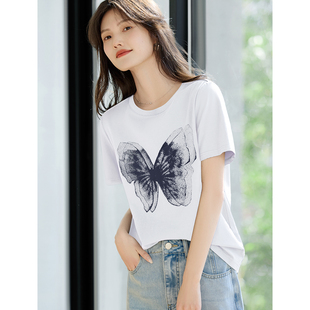 XWI欣未渐变蝴蝶印花图案短袖 T恤女夏季 通勤百搭上衣 花间蝶影