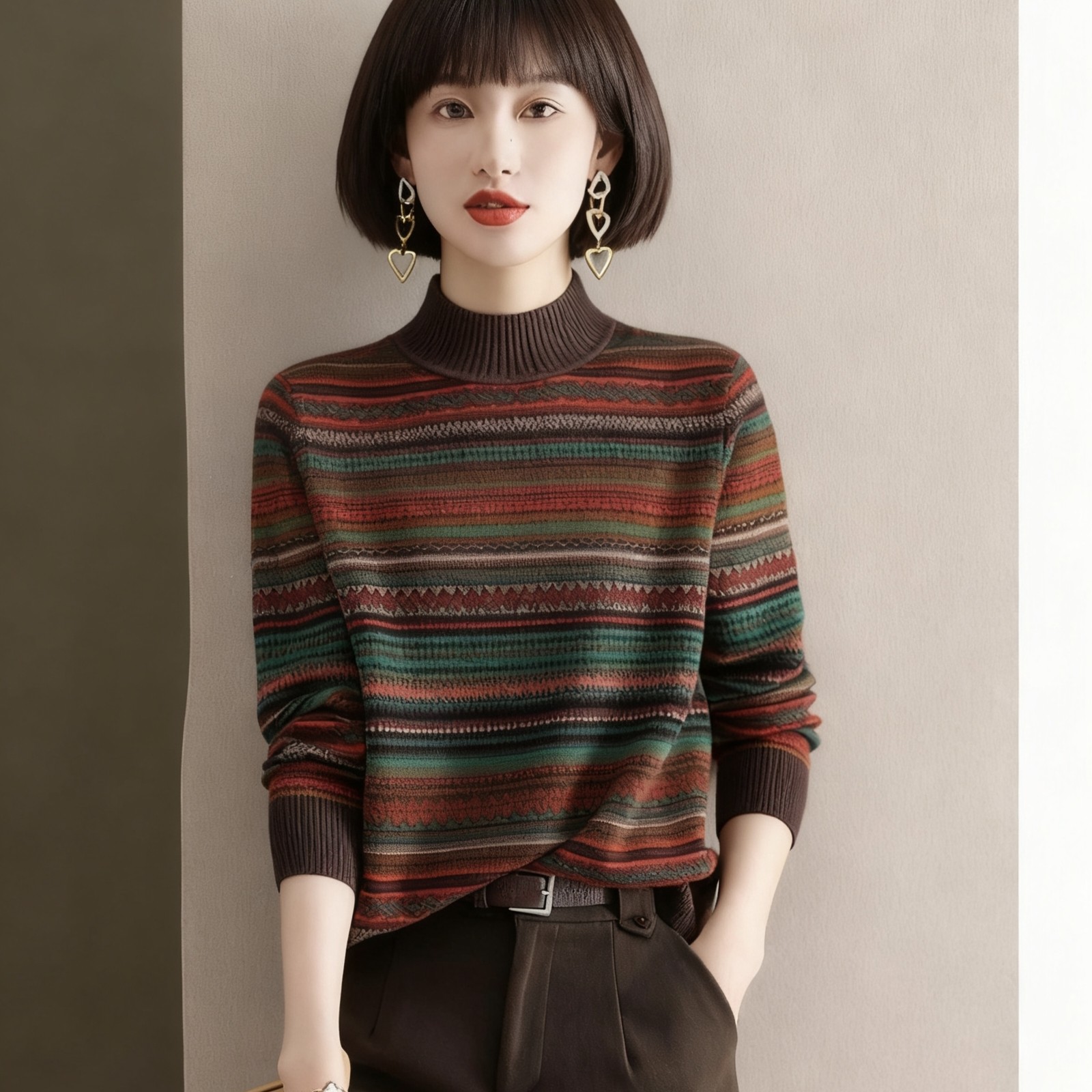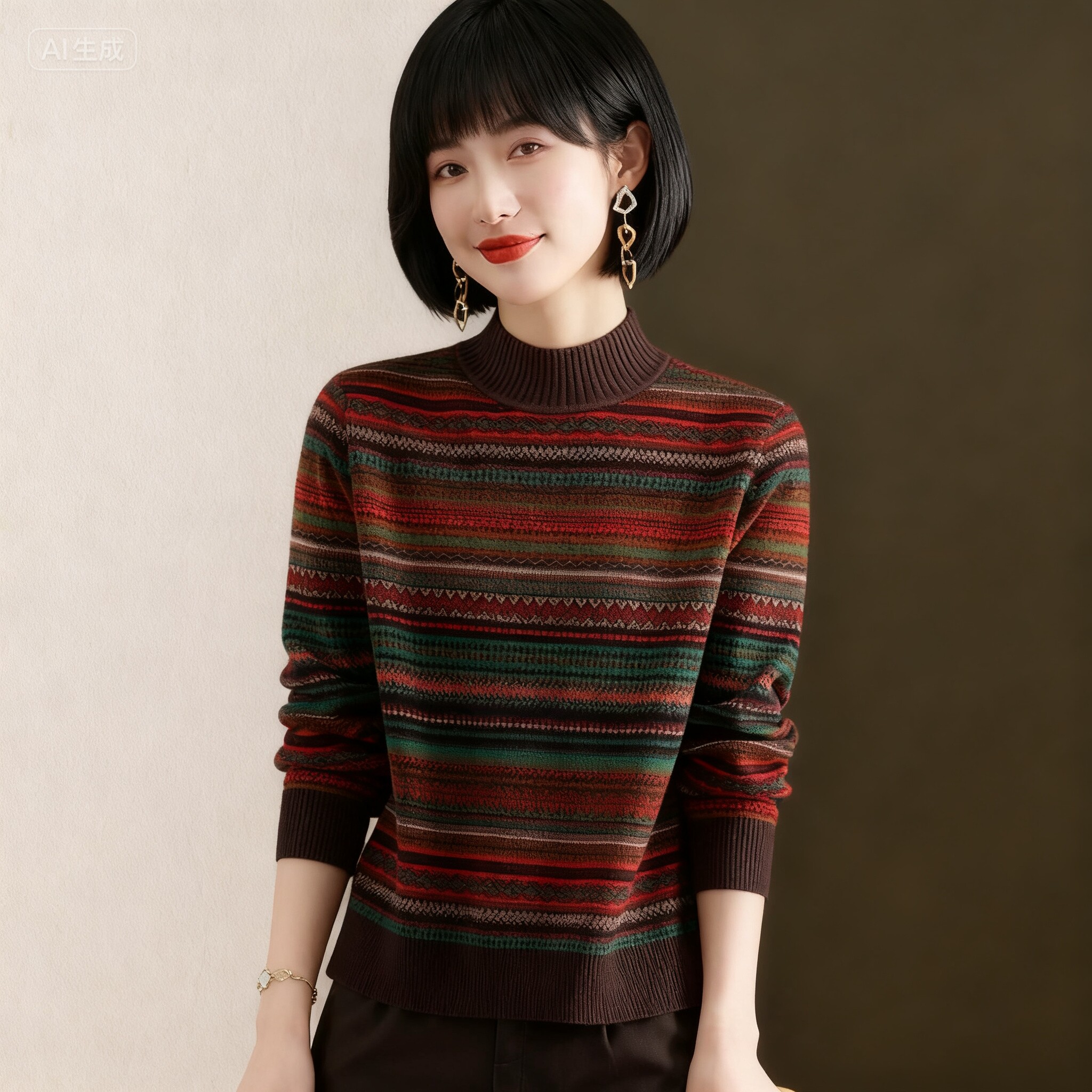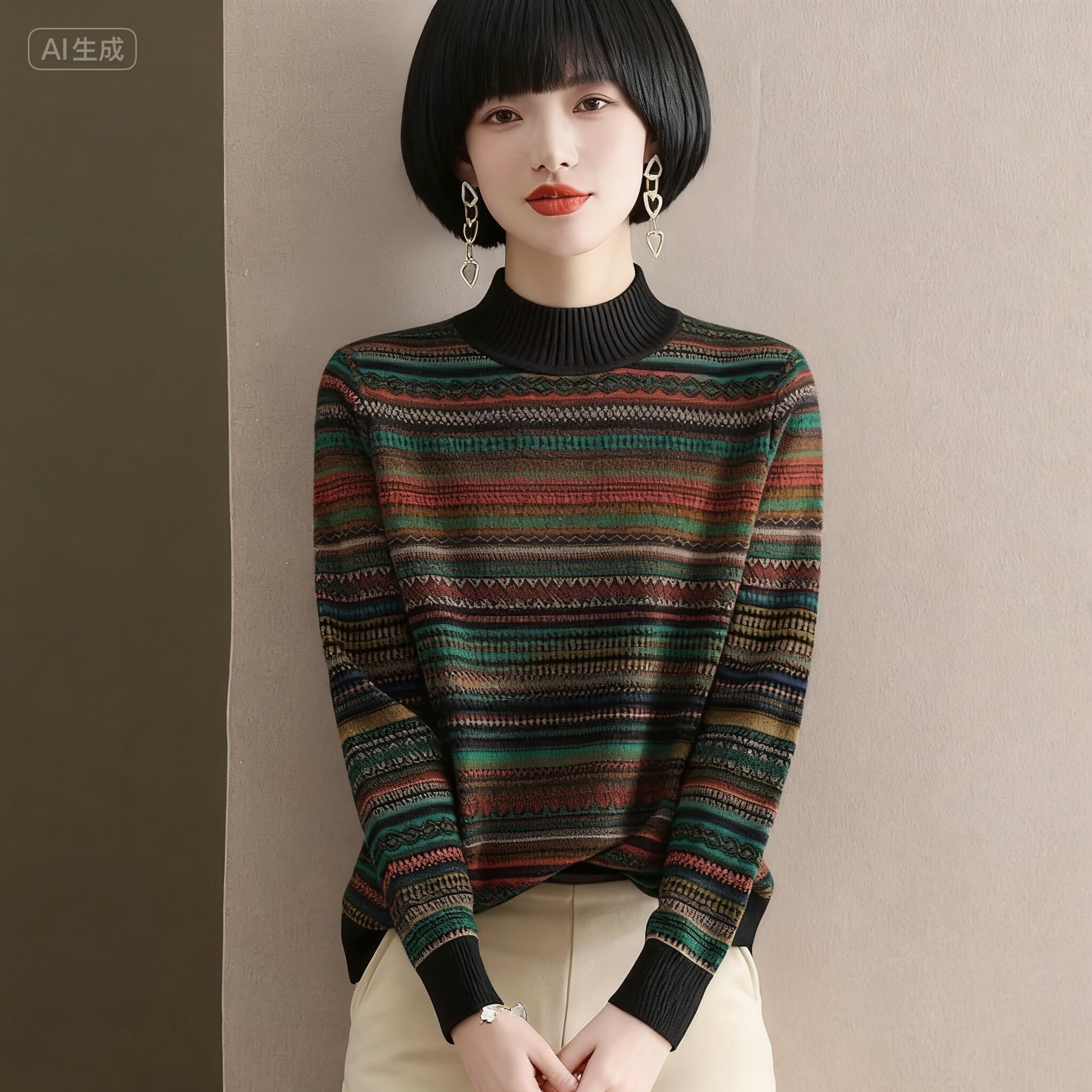 为您提供商品复古民族风秋冬长袖 百搭宽松条纹半高领毛衣女 网红针织时尚的详细介绍,
