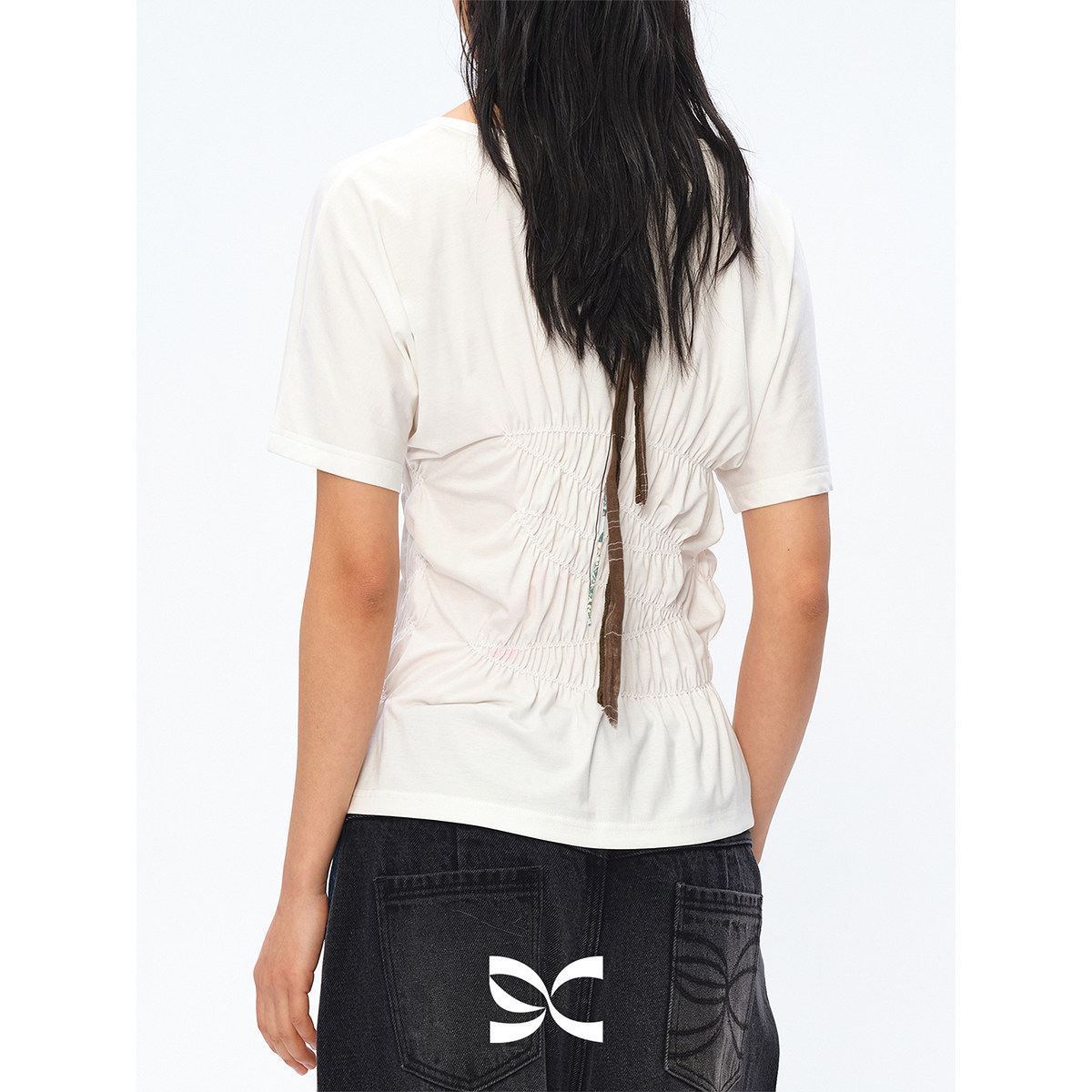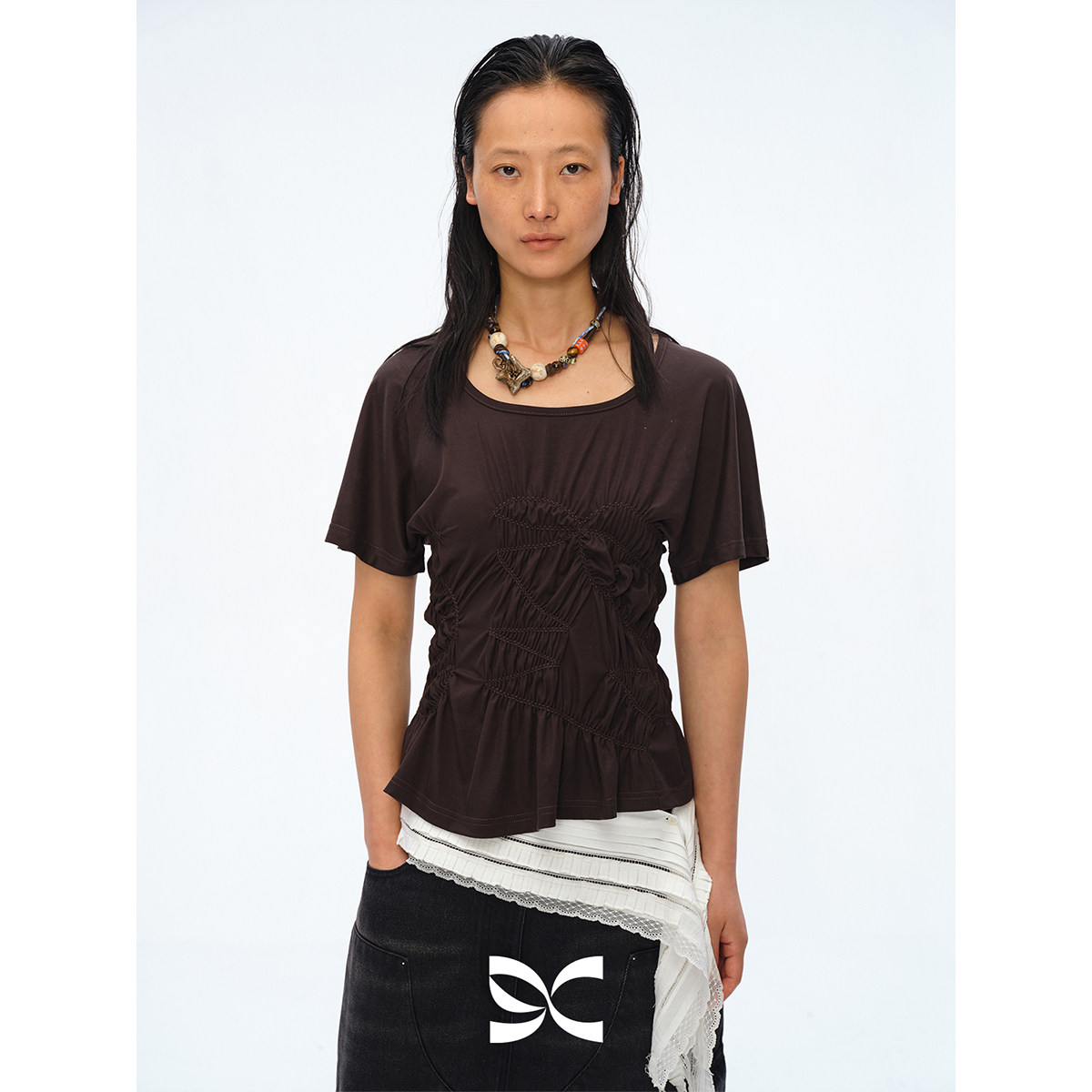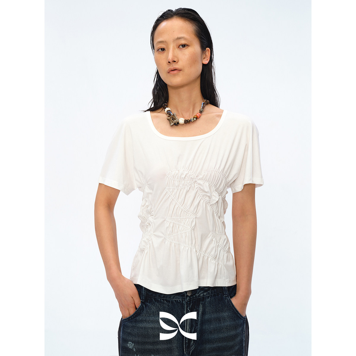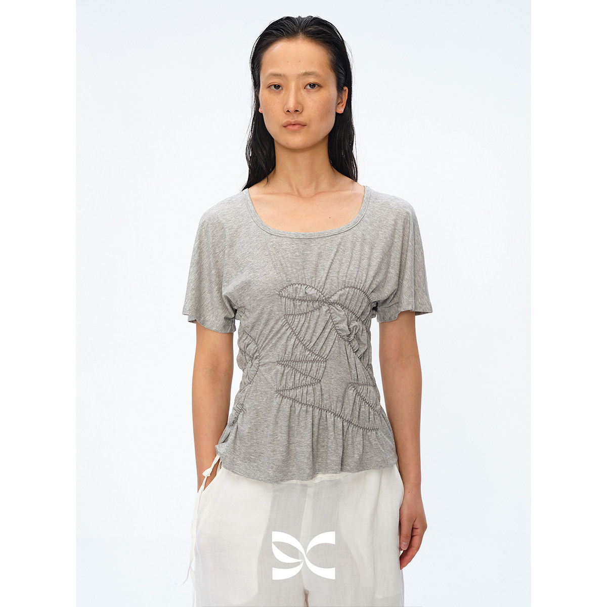 方圆设计感U领不规则立裁抽褶打揽针织短袖 上衣 Circle Square