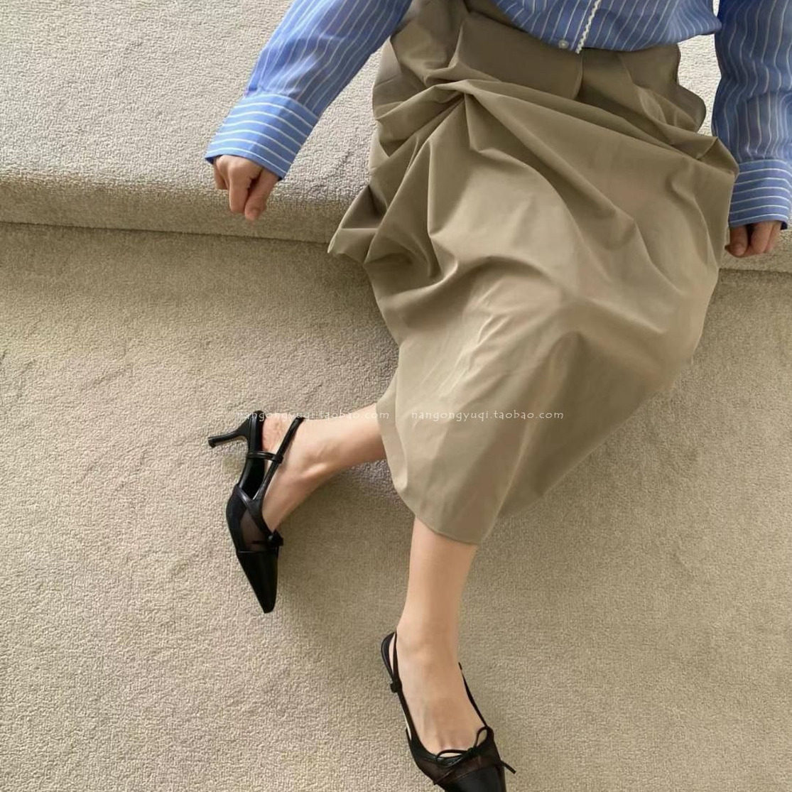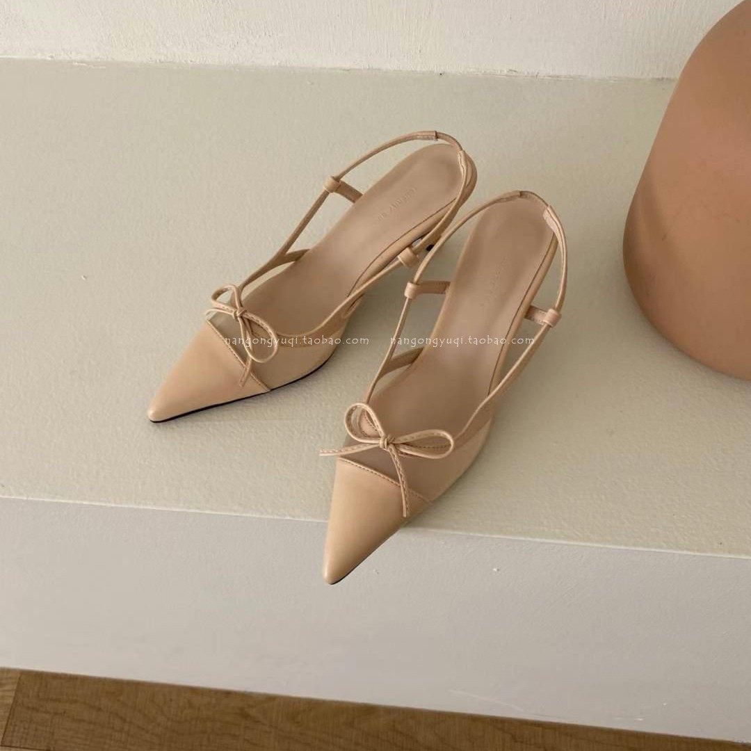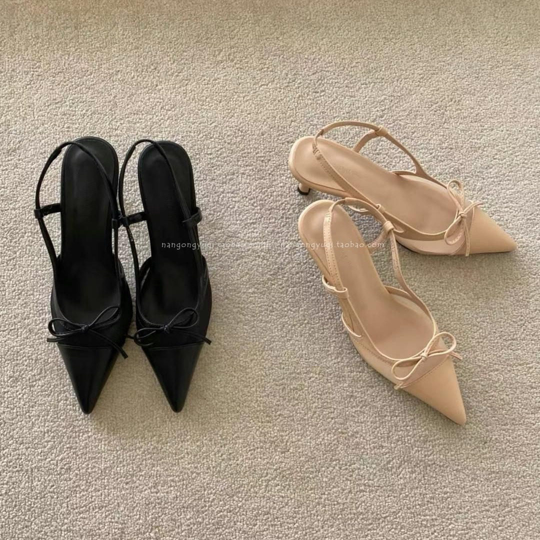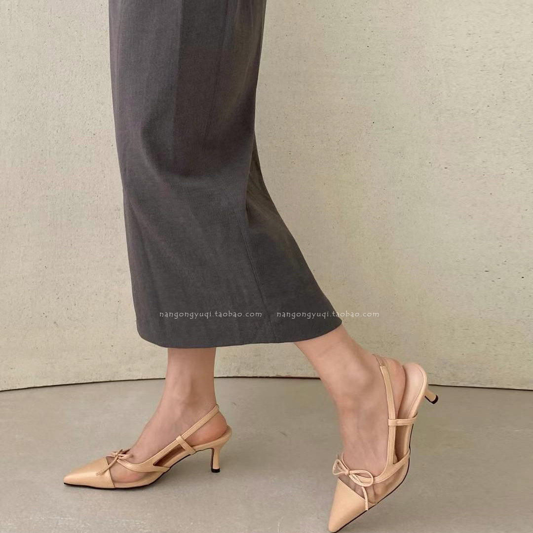 ins法式 简约尖头蝴蝶结网纱后绊带猫跟凉 25夏新款 韩国东大门女鞋